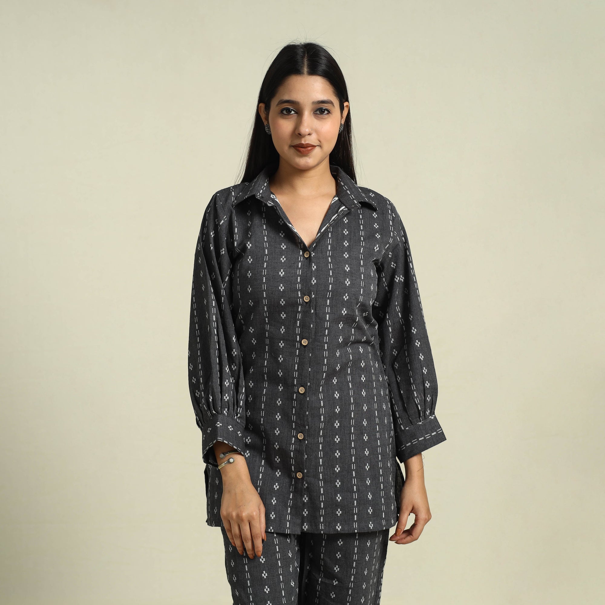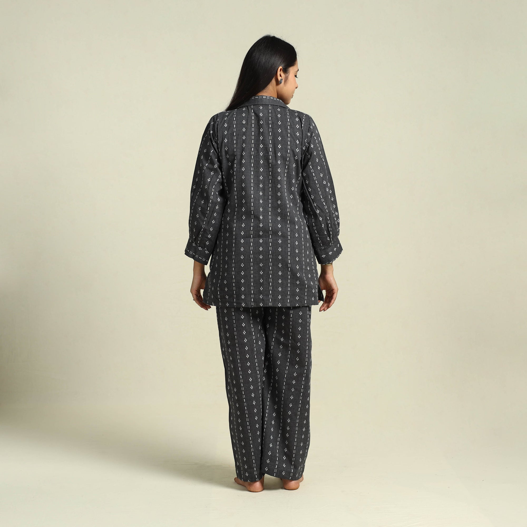 Slip into serene comfort with this stylish black jacquard cotton night suit set. The soft cotton top provides a cozy feel, while the flowy pyjama with an elastic waistband provide a comfortable. The addition of two side pockets enhances its practicality, making it a must have for those who love comfort with a touch of convenience. This piece carries tiny knots, thread pulls, or uneven lines — not flaws, but fingerprints. Every irregularity is a whisper from the hands that made it. It’s what happens when tradition weaves through time, not machines. If you’re looking for perfection, this isn’t it. But if you’re looking for soul — you’ve found it.