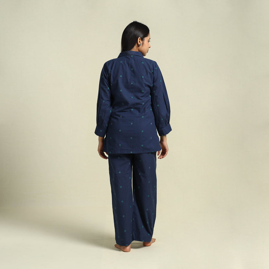 Slip into serene comfort with this stylish blue jacquard cotton night suit set. The soft cotton top provides a cozy feel, while the flowy pyjama with an elastic waistband provide a comfortable. The addition of two side pockets enhances its practicality, making it a must have for those who love comfort with a touch of convenience.