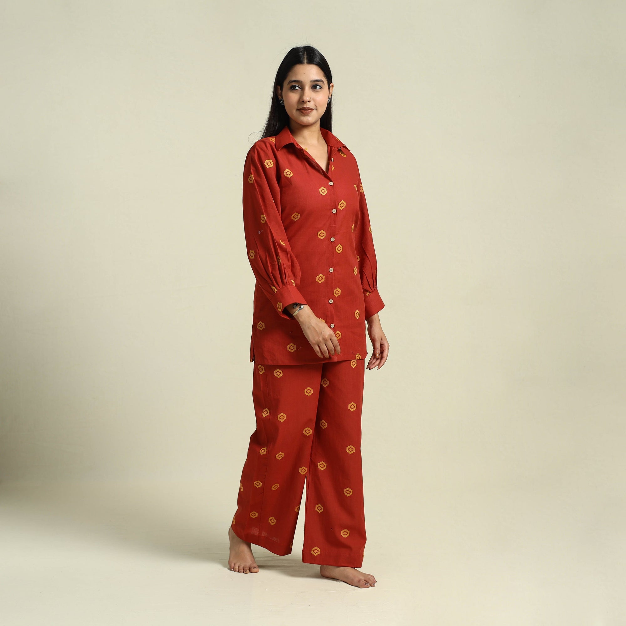 Slip into serene comfort with this stylish red jacquard cotton night suit set. The soft cotton top provides a cozy feel, while the flowy pyjama with an elastic waistband provide a comfortable. The addition of two side pockets enhances its practicality, making it a must have for those who love comfort with a touch of convenience.