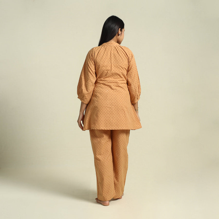 Slip into serene comfort with this stylish brown jacquard cotton night suit set. The soft cotton top provides a cozy feel, while the flowy pyjama with an elastic waistband provide a comfortable. The addition of two side pockets enhances its practicality, making it a must have for those who love comfort with a touch of convenience. This piece carries tiny knots, thread pulls, or uneven lines — not flaws, but fingerprints. Every irregularity is a whisper from the hands that made it. It’s what happens when tradition weaves through time, not machines. If you’re looking for perfection, this isn’t it. But if you’re looking for soul — you’ve found it.