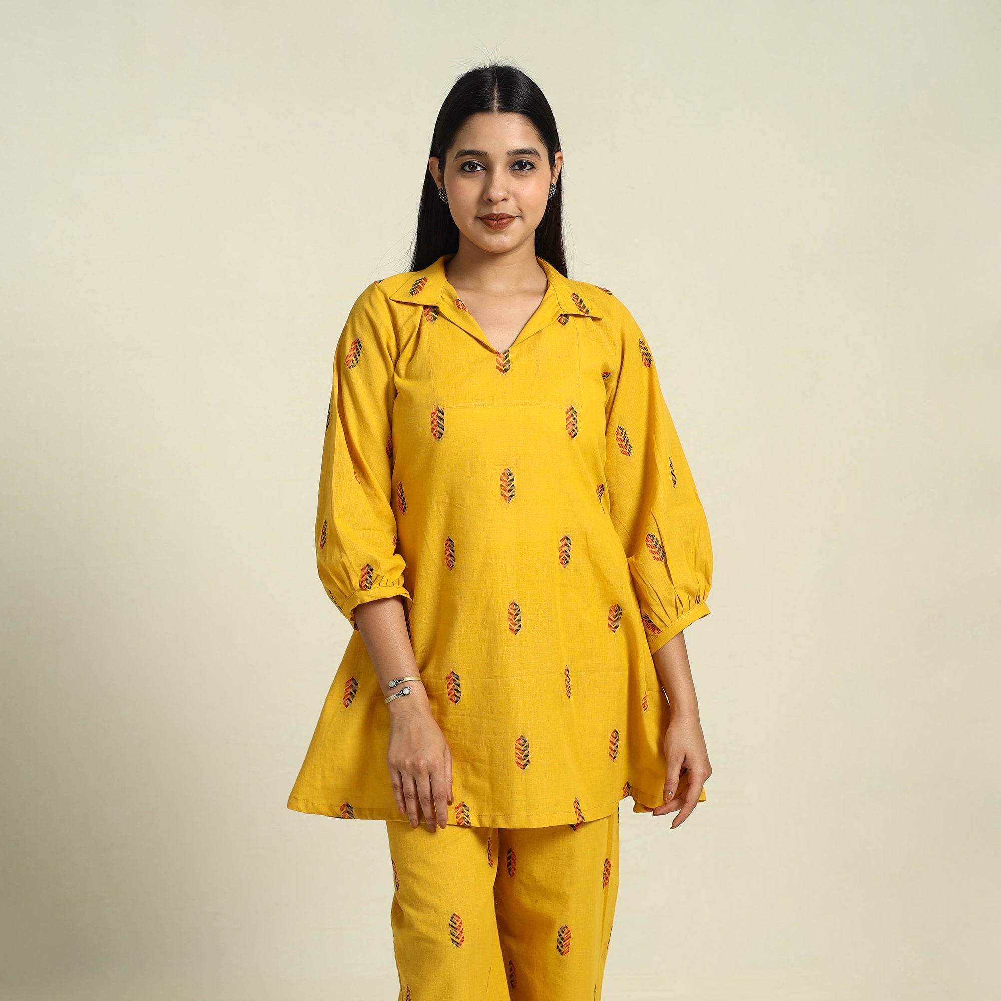 Slip into serene comfort with this stylish yellow jacquard cotton night suit set. The soft cotton top provides a cozy feel, while the flowy pyjama with an elastic waistband provide a comfortable. The addition of two side pockets enhances its practicality, making it a must have for those who love comfort with a touch of convenience.