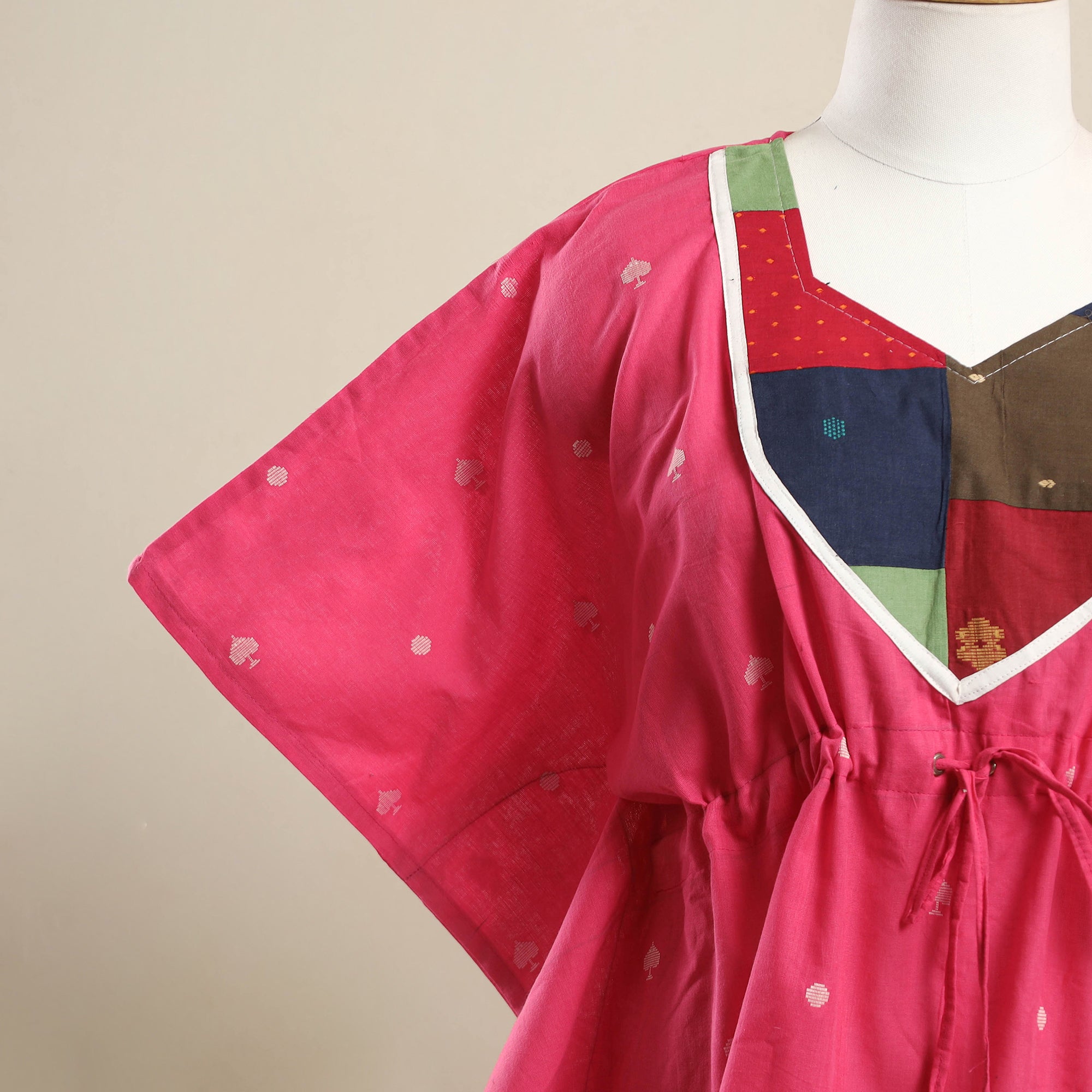 Experience the perfect blend of tradition and comfort with this pink jacquard mosaic fusion cotton kaftan, designed for effortless style. Made from breathable cotton, the kaftan drapes gracefully with its relaxed fit. The adjustable drawstring waist ensures a custom fit, making it ideal for lounging, vacations, or casual day outs.