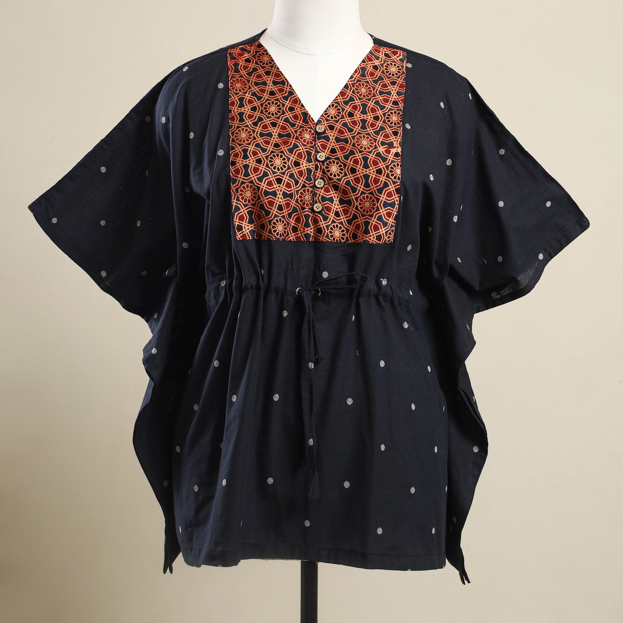 Experience the perfect blend of tradition and comfort with this black jacquard mosaic fusion cotton kaftan, designed for effortless style. Made from breathable cotton, the kaftan drapes gracefully with its relaxed fit. The adjustable drawstring waist ensures a custom fit, making it ideal for lounging, vacations, or casual day outs.