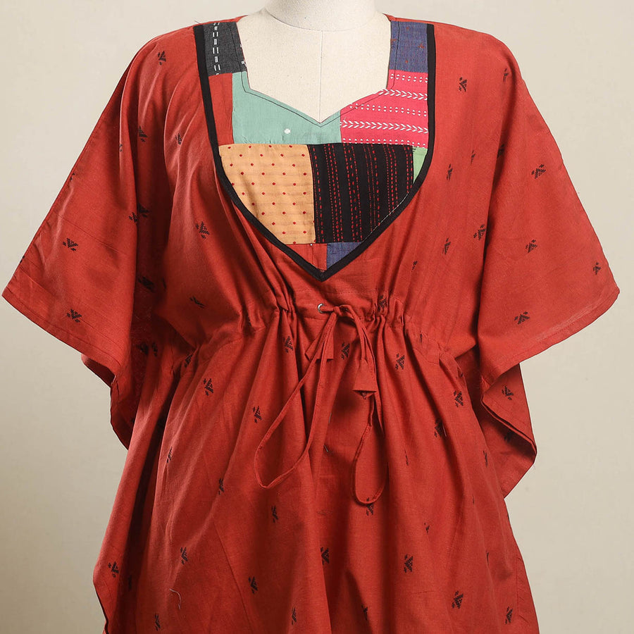Stay stylish and comfortable with this red jacquard mosaic fusion cotton kaftan, designed for a relaxed fit. Made from lightweight cotton, it features flowy sleeves and a drawstring waist for an adjustable silhouette. Perfect for lounging, beach outings, or casual wear, its soft fabric ensures all day comfort.