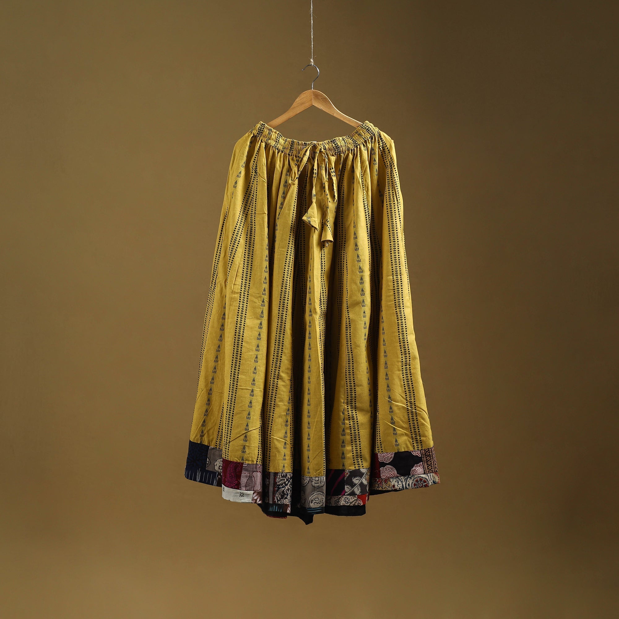 Yellow jacquard cotton patchwork long skirt offers an elasticated waist with a tie-up for a comfortable, adjustable fit. Its intricate woven patterns are created using the jacquard weaving technique, giving the fabric a beautifully detailed look. The 24-kali patchwork design and patchwork border add a unique touch. Perfect for daily wear, vacations or relaxed outings.