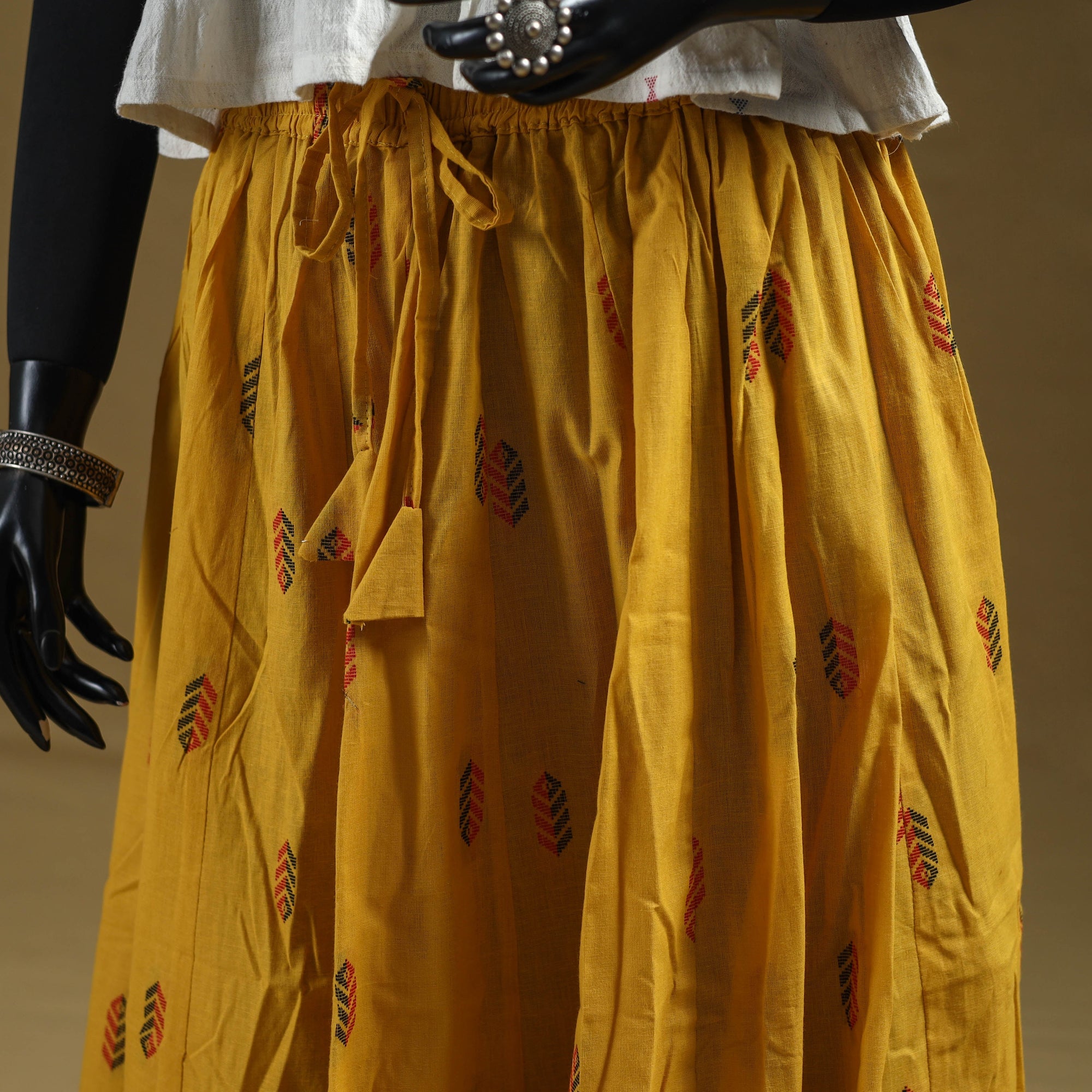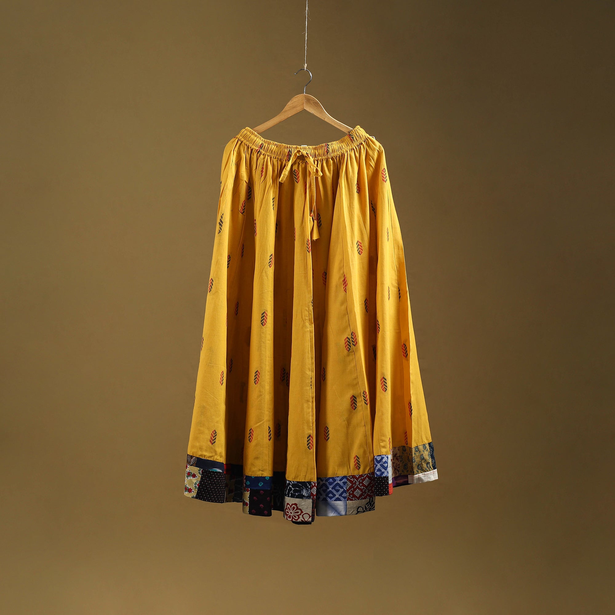 Yellow jacquard cotton patchwork long skirt offers an elasticated waist with a tie-up for a comfortable, adjustable fit. Its intricate woven patterns are created using the jacquard weaving technique, giving the fabric a beautifully detailed look. The 24-kali patchwork design and patchwork border add a unique touch. Perfect for daily wear, vacations or relaxed outings.