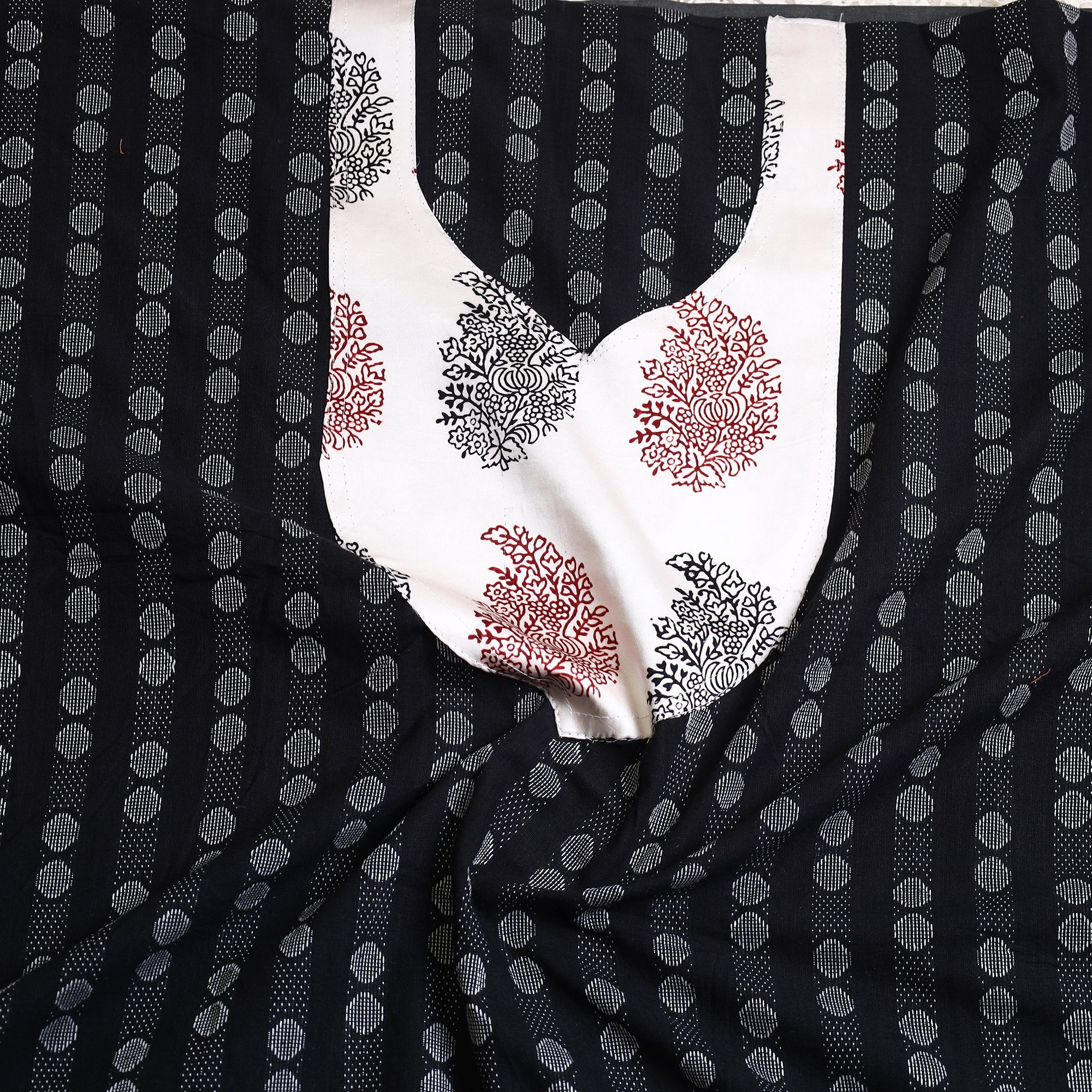 Upgrade your ethnic wardrobe with this black jacquard patchwork cotton fabric. Woven with precision using the traditional Jacquard technique, it showcases refined motifs that merge timeless charm with a modern touch. Perfect for tailored kurtas, it brings together breathable comfort and graceful design for everyday elegance.