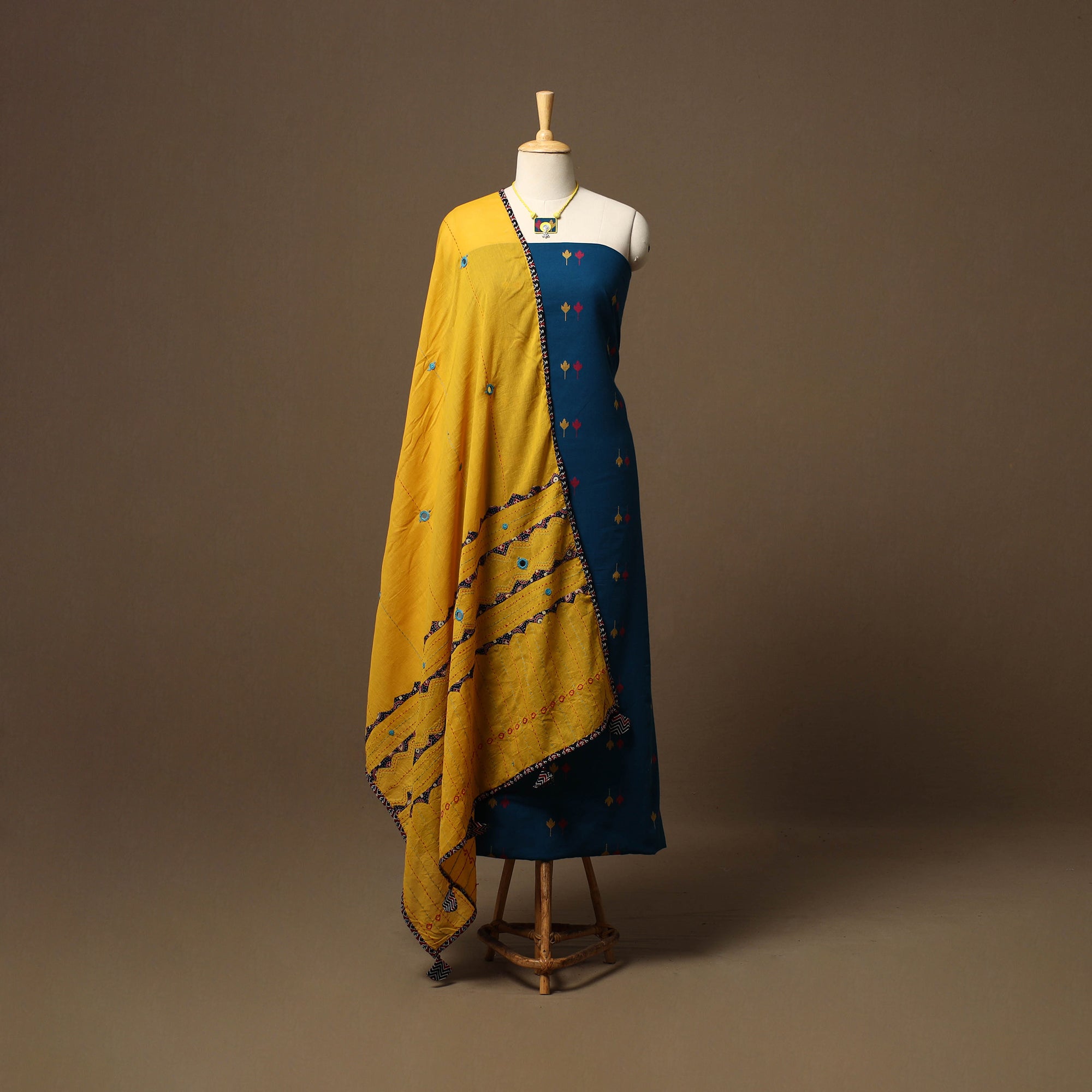 2pc unstitched dress material set features a jacquard weave cotton kurta fabric, perfect for everyday elegance. It comes paired with a cotton ajrakh applique work tagai dupatta that adds soft texture and grace. Completing the set is a handcrafted necklace with matching earrings, making it a ready-to-style ensemble for effortless ethnic wear.