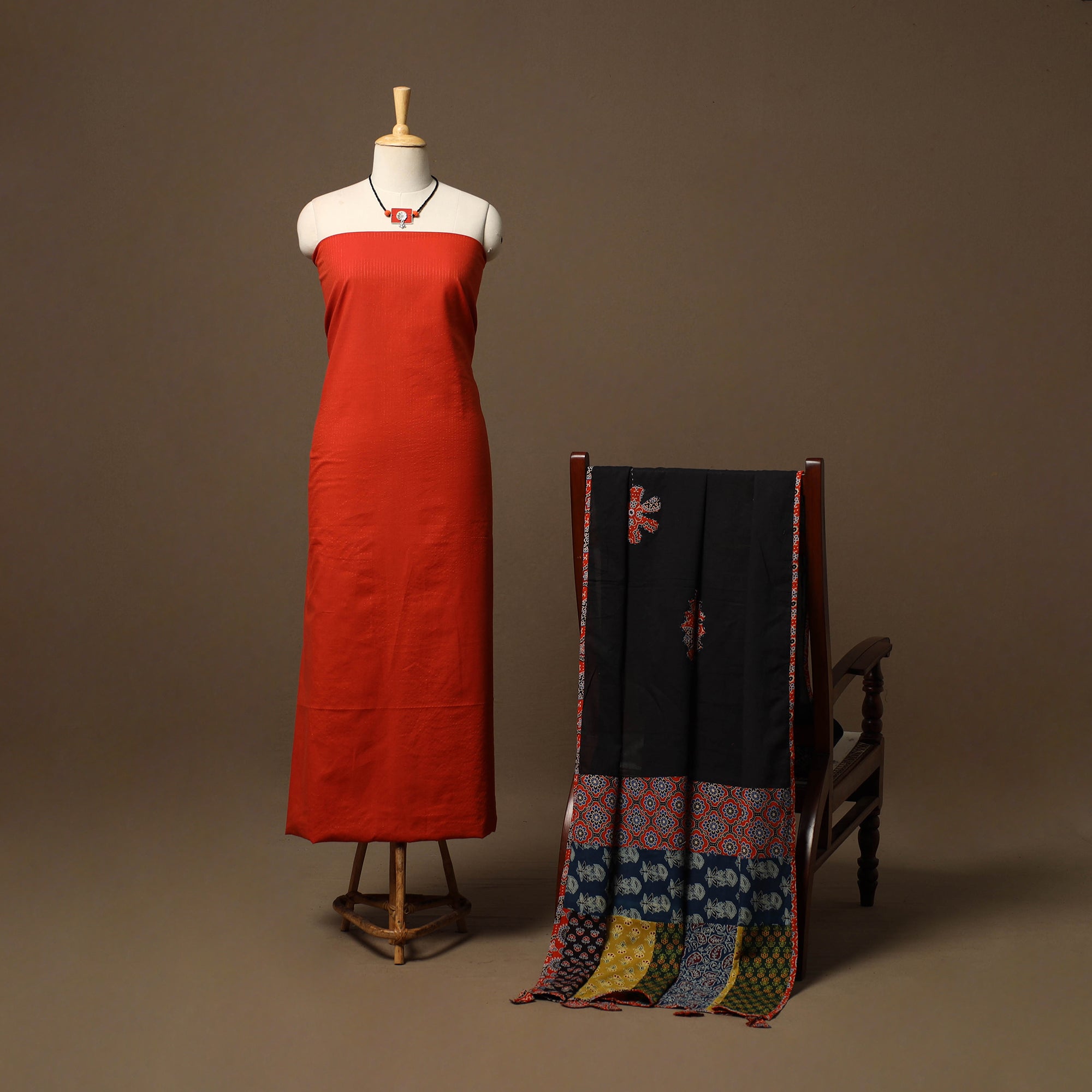 2pc unstitched dress material set features a jacquard weave cotton kurta fabric, perfect for everyday elegance. It comes paired with a cotton ajrakh applique work tagai dupatta that adds soft texture and grace. Completing the set is a handcrafted necklace with matching earrings, making it a ready-to-style ensemble for effortless ethnic wear.