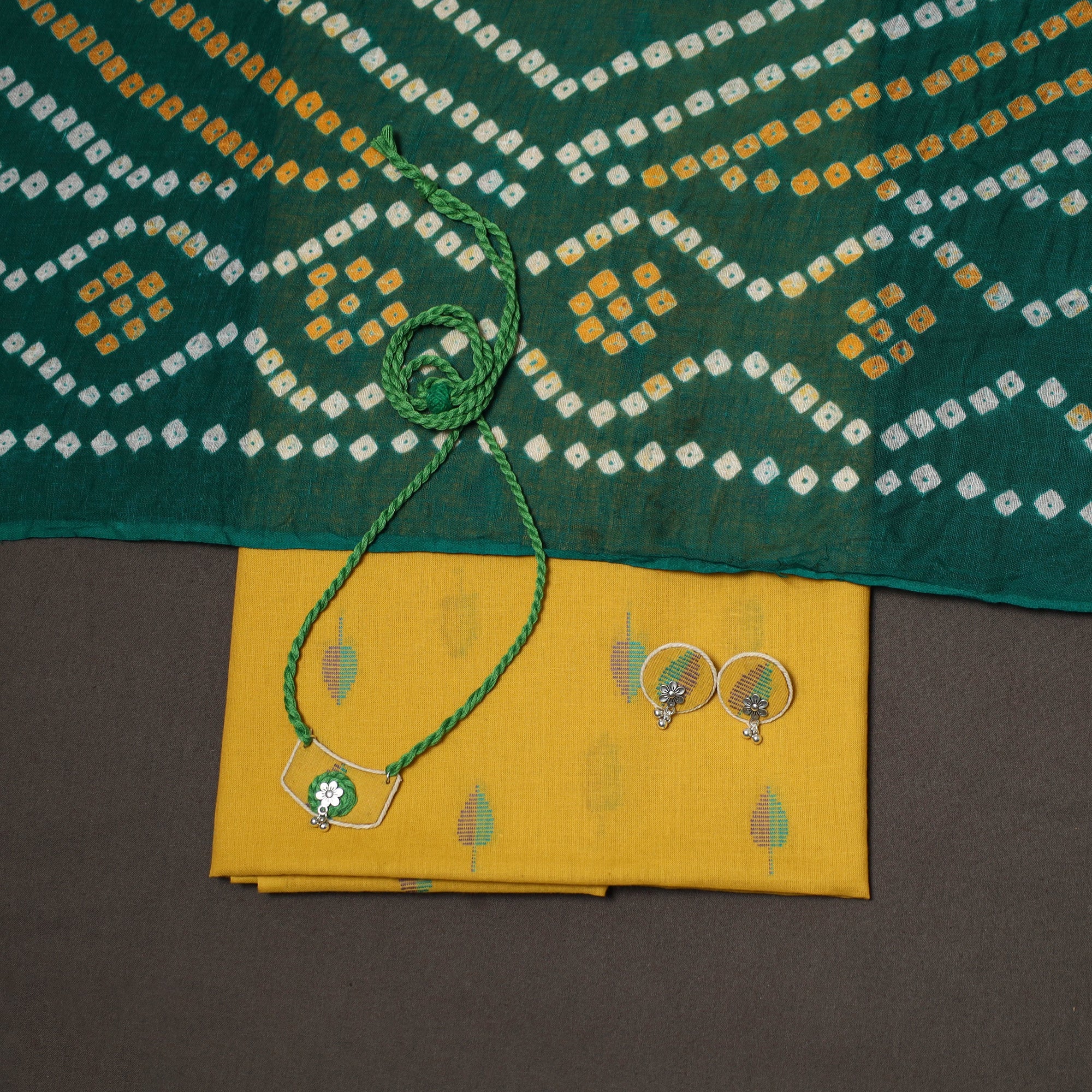 2pc unstitched dress material set features a jacquard weave cotton kurta fabric, perfect for everyday elegance. It comes paired with a cotton bandhani dupatta that adds soft texture and grace. Completing the set is a handcrafted necklace with matching earrings, making it a ready-to-style ensemble for effortless ethnic wear.