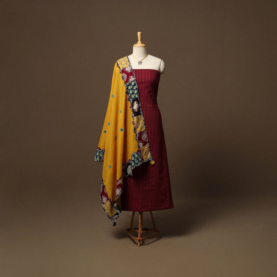 2pc unstitched dress material set features a jacquard weave cotton kurta fabric, perfect for everyday elegance. It comes paired with a cotton ajrakh applique work tagai dupatta that adds soft texture and grace. Completing the set is a handcrafted necklace with matching earrings, making it a ready-to-style ensemble for effortless ethnic wear.