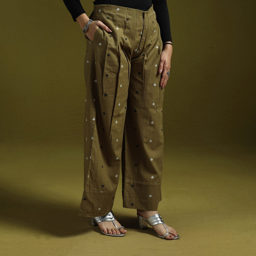 Green jacquard palazzo features an elasticated waistband, decorative front buttons and functional pockets for added convenience. The fabric is woven using the jacquard technique, which creates raised patterns directly into the weave. Made from breathable cotton, it is comfortable to wear and easy to style with different tops and kurtas.
