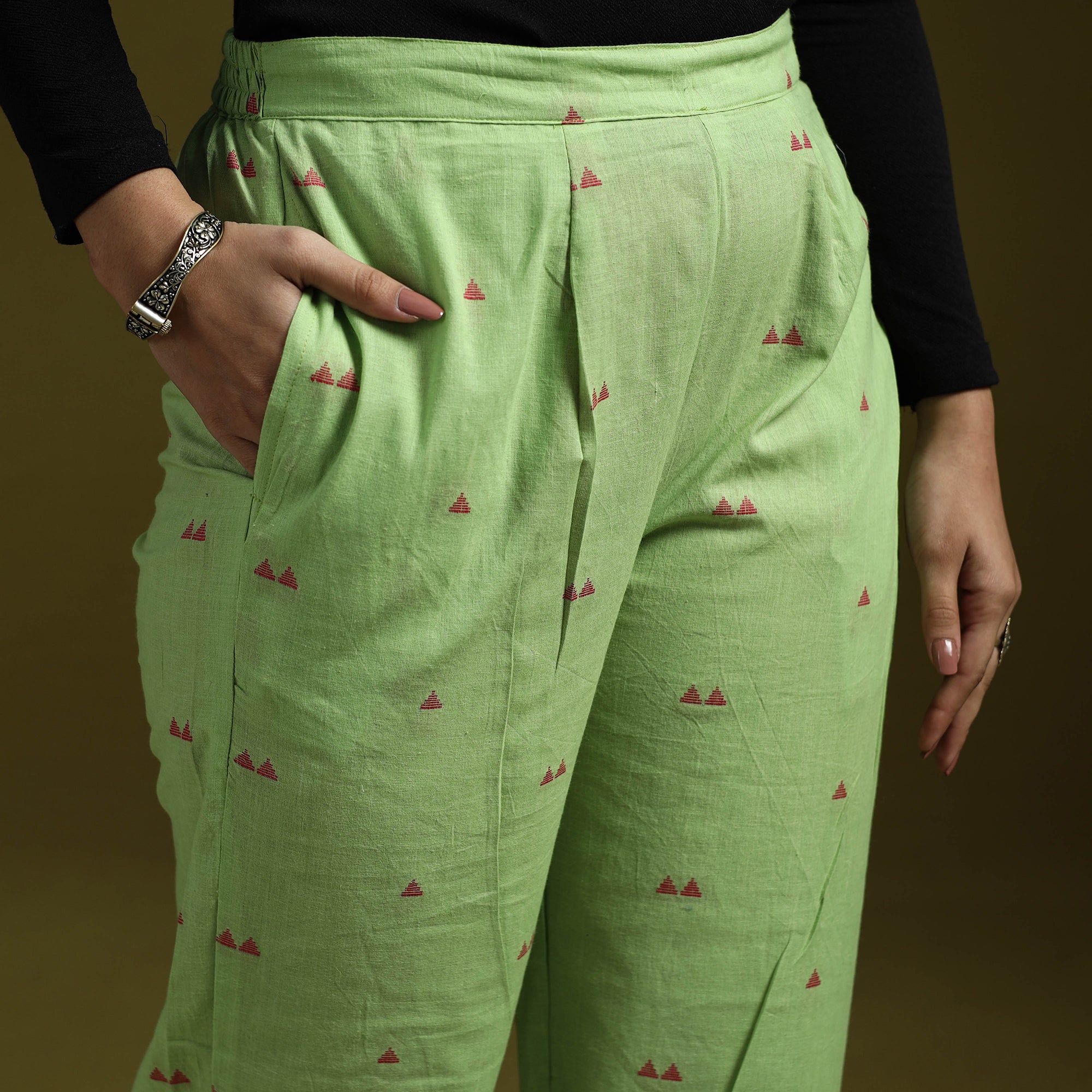Green jacquard pant, features elasticated waistband and functional pockets for added convenience. The fabric is woven using the jacquard technique which creates raised patterns directly into the weave. Made from breathable cotton it is comfortable to wear and easy to style with different tops and kurtas.