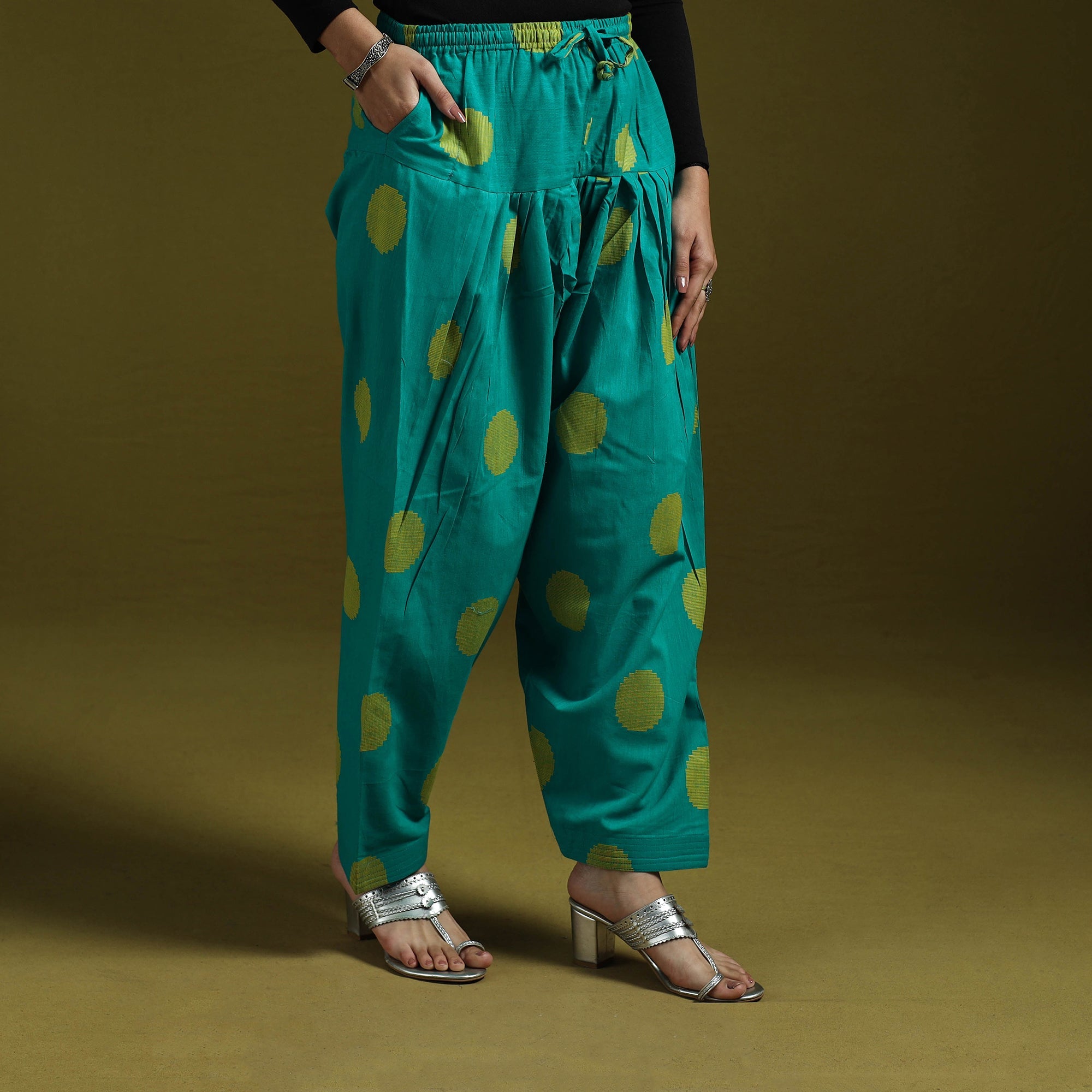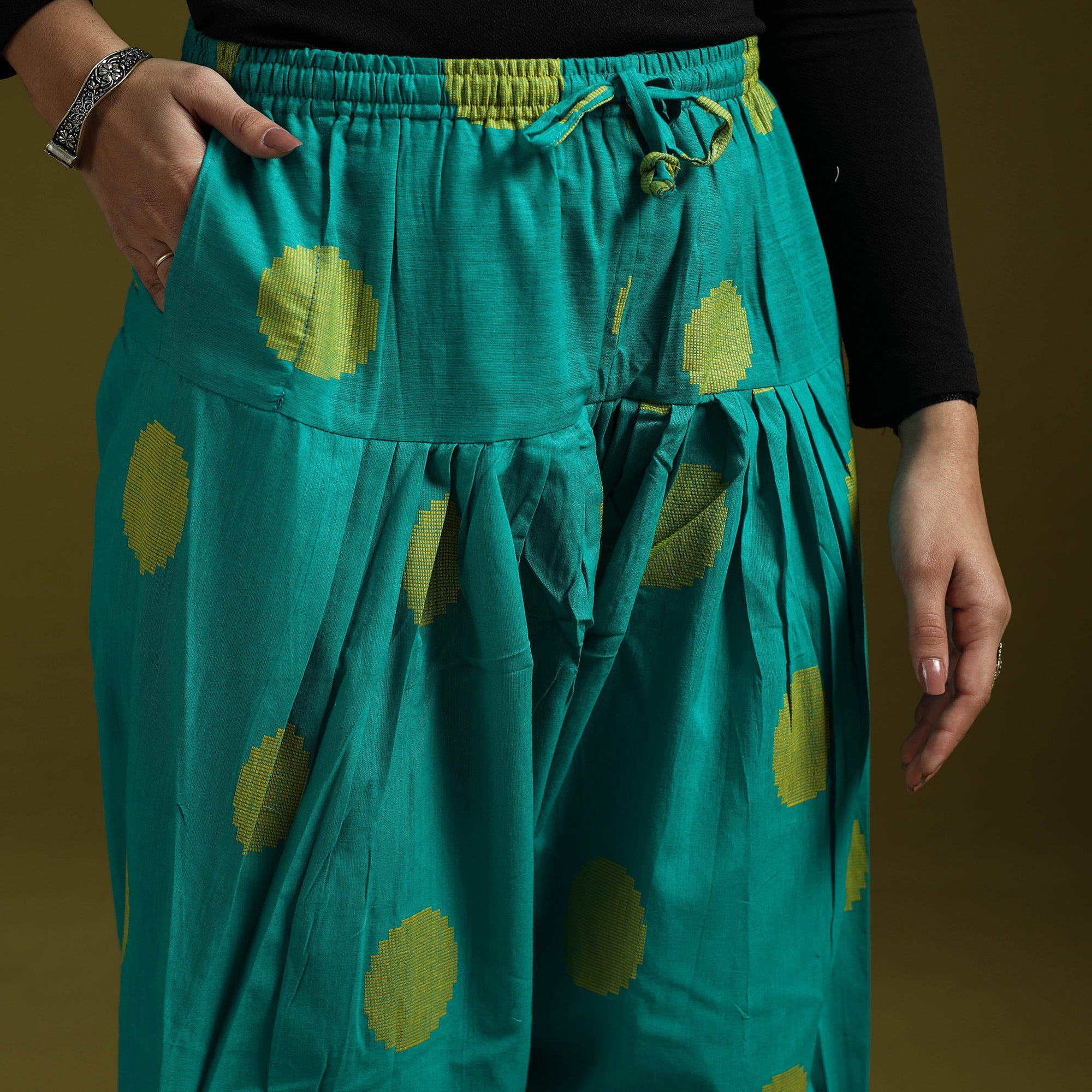 Jacquard salwar, features elasticated waistband with drawstring for easy adjustment and functional pocket for added convenience. The fabric is woven using the jacquard technique which creates raised patterns directly into the weave. Made from breathable cotton it is comfortable to wear and easy to style with different tops and kurtas.