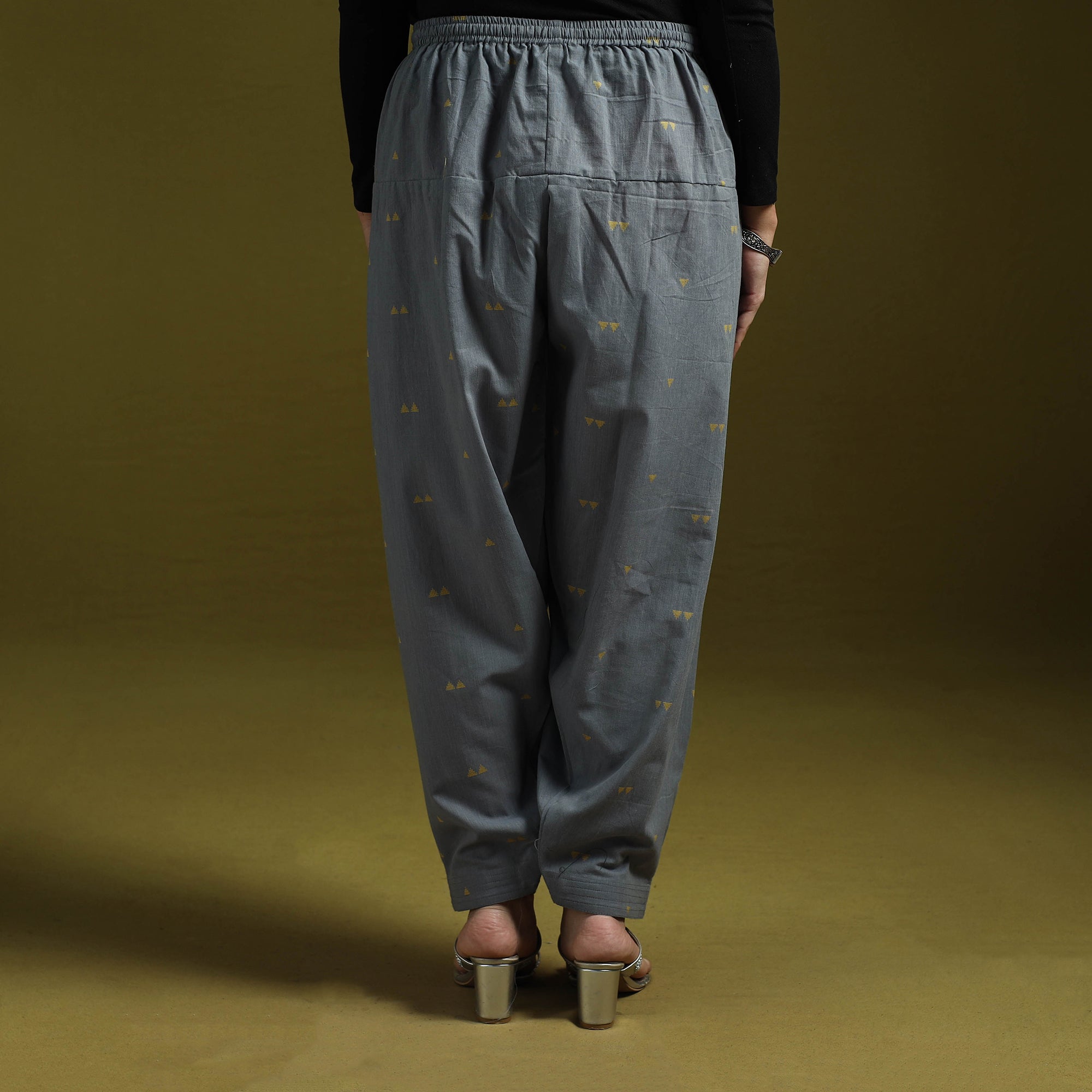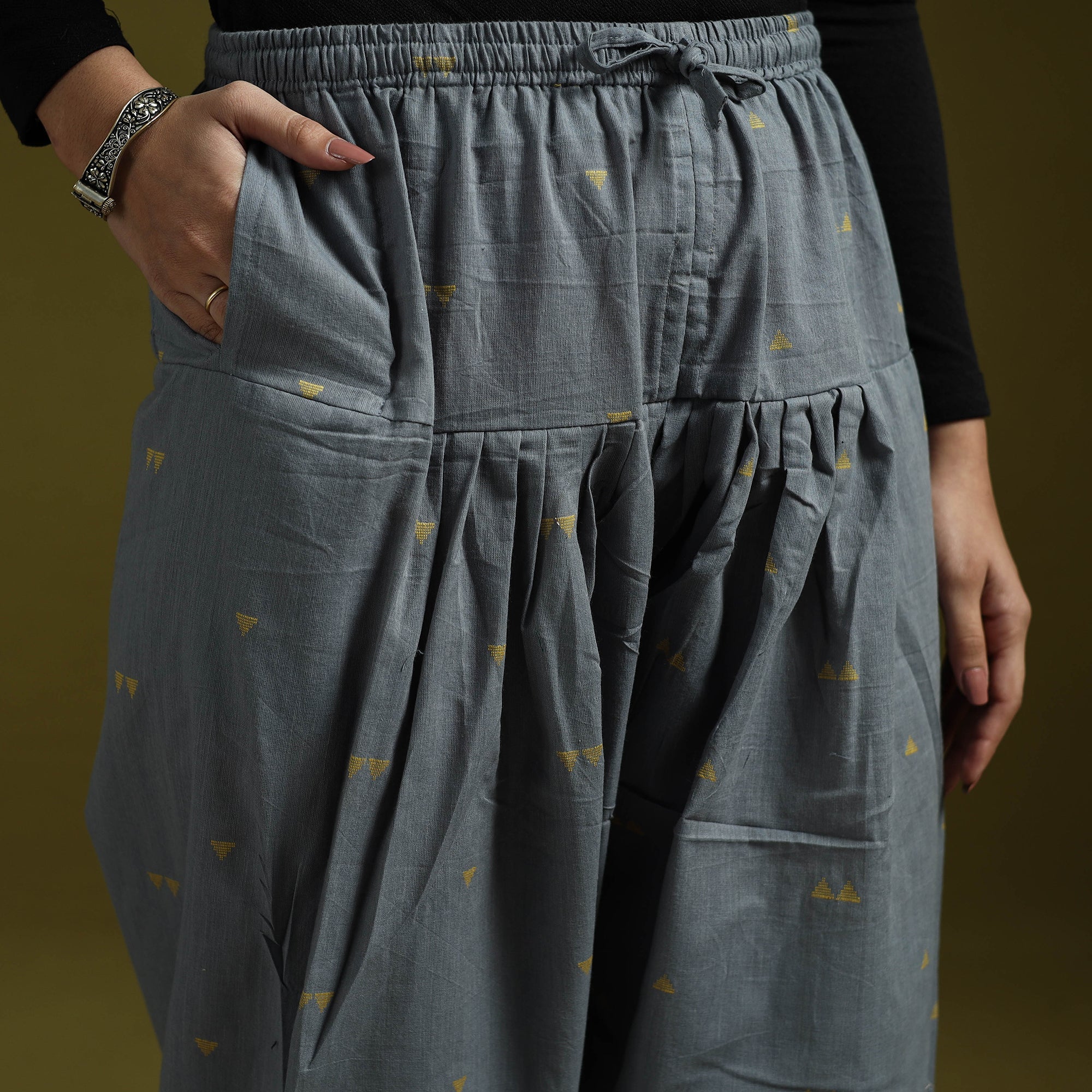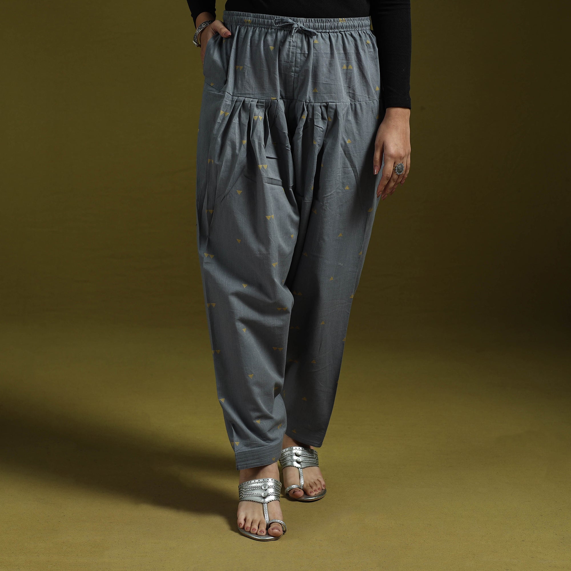 Jacquard salwar, features elasticated waistband with drawstring for easy adjustment and functional pocket for added convenience. The fabric is woven using the jacquard technique which creates raised patterns directly into the weave. Made from breathable cotton it is comfortable to wear and easy to style with different tops and kurtas.