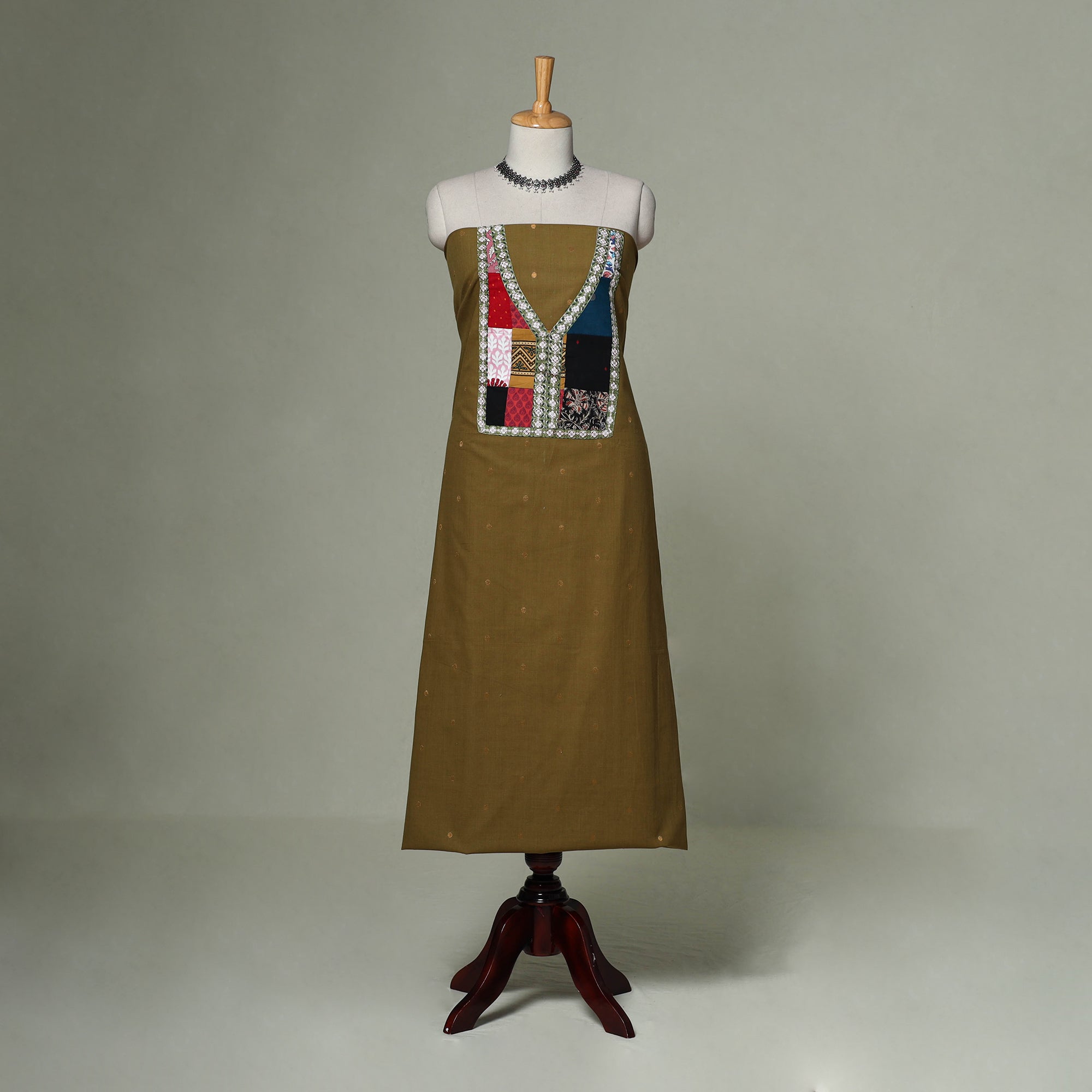 | Material | Green jacquard weave cotton unstitched kurta material is soft, breathable and ideal for everyday comfort. It is made using a jacquard loom, where the design is woven directly into the fabric rather than printed on the surface. This technique creates beautiful patterns with a slightly raised texture that gives the fabric a rich and detailed look. A neatly handcrafted patchwork detail enhances the front neckline, adding a refined touch. It is suitable for stitching daily wear kurtas, office ready outfits or relaxed casual styles. |
