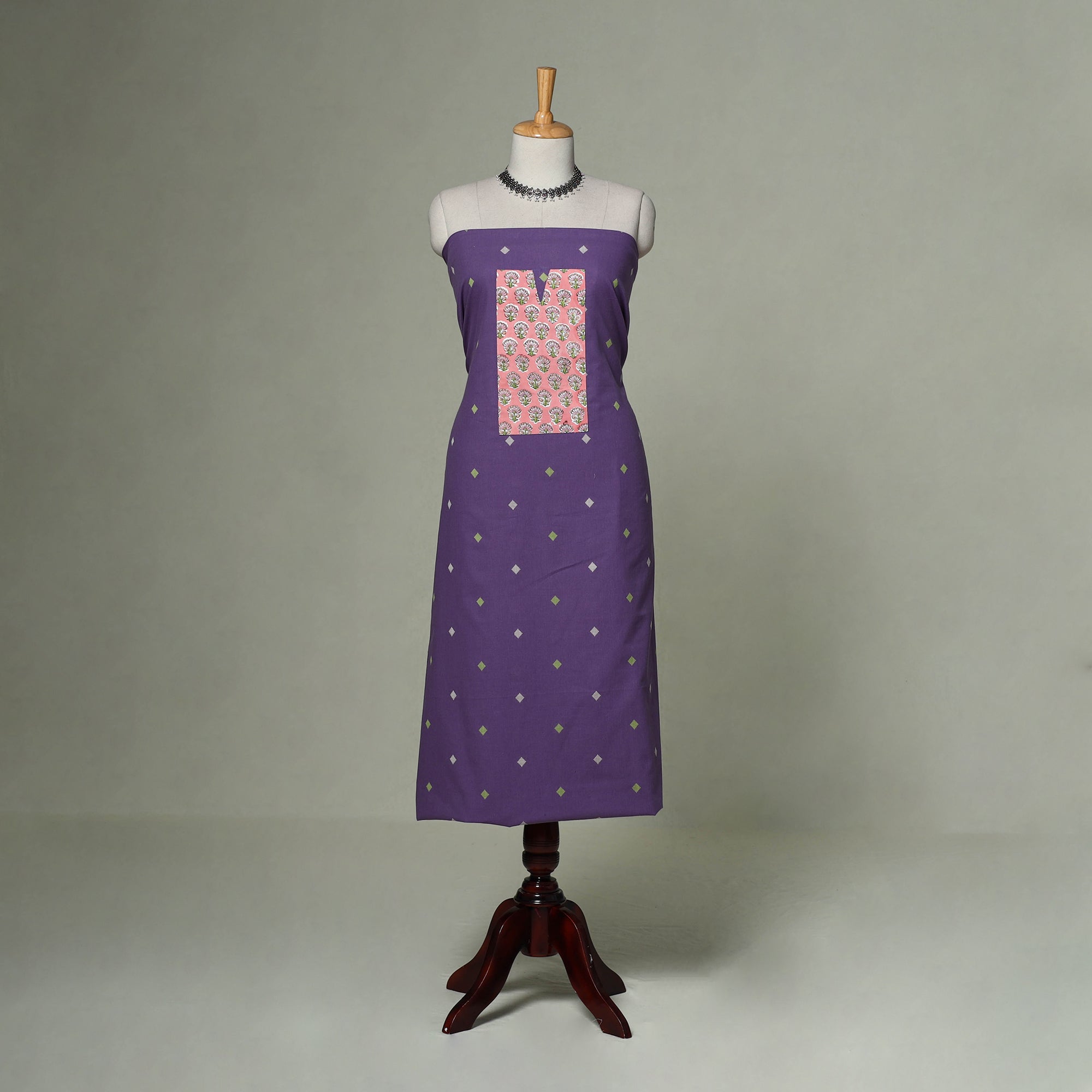 | Material | Purple jacquard weave cotton unstitched kurta material is soft, breathable and ideal for everyday comfort. It is made using a jacquard loom, where the design is woven directly into the fabric rather than printed on the surface. This technique creates beautiful patterns with a slightly raised texture that gives the fabric a rich and detailed look. A neatly handcrafted patchwork detail enhances the front neckline, adding a refined touch. It is suitable for stitching daily wear kurtas, office ready outfits or relaxed casual styles. |