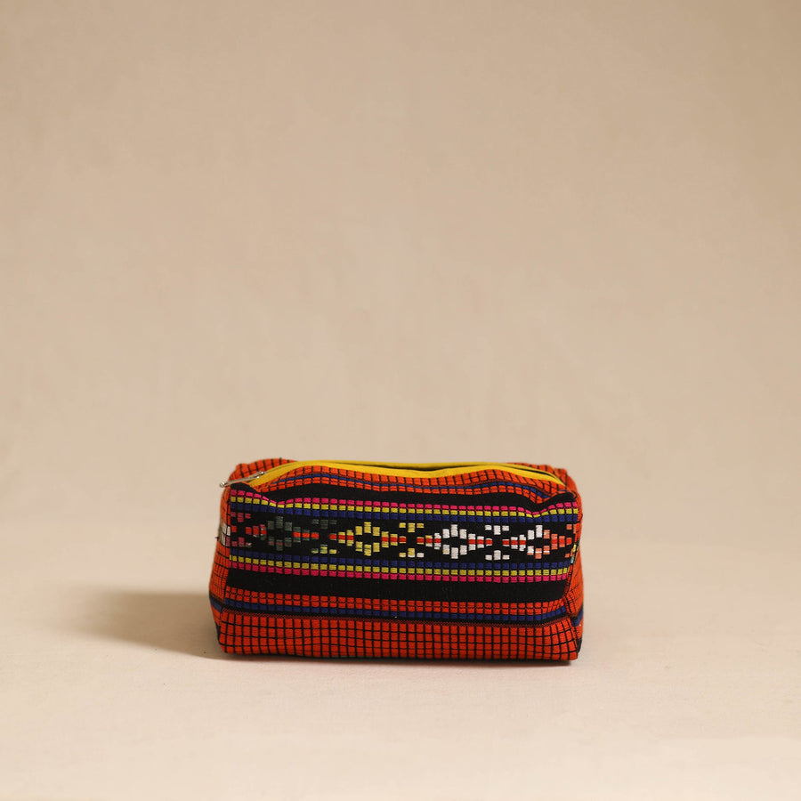 Crafted from jacquard cotton, this orange handmade toiletry pouch is both functional and fashionable. Lined with waterproof plastic, it’s ideal for carrying cosmetics, grooming items, or travel essentials. Perfect for daily use or travel, this pouch reflects traditional Indian textile artistry with a modern twist.