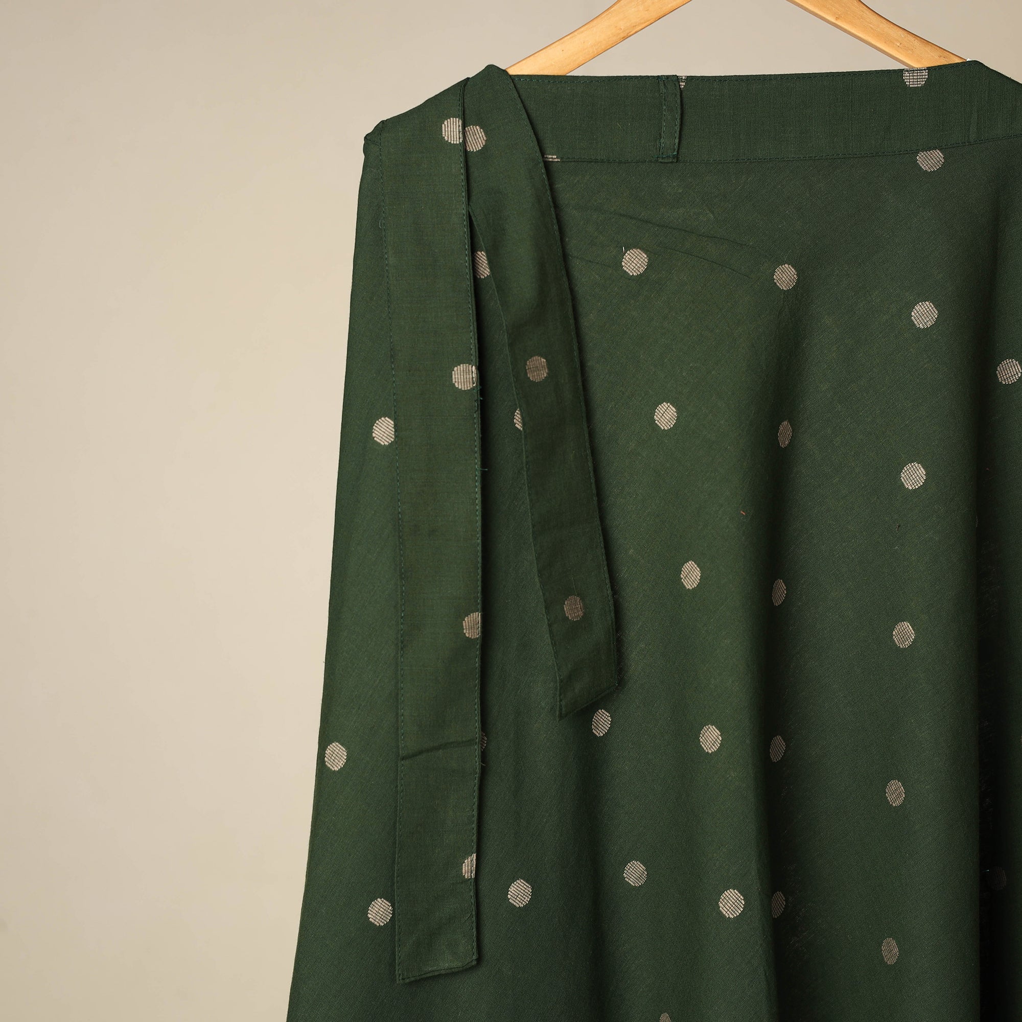 Green jacquard cotton wrap-around skirt offers an easy tie-up waist closure for a comfortable, adjustable fit. Its intricate woven patterns are made using the jacquard weaving technique, giving the fabric a beautifully detailed look. The wrap style makes it effortless to wear and flattering for all body types. Perfect for daily wear, vacations or relaxed outings.