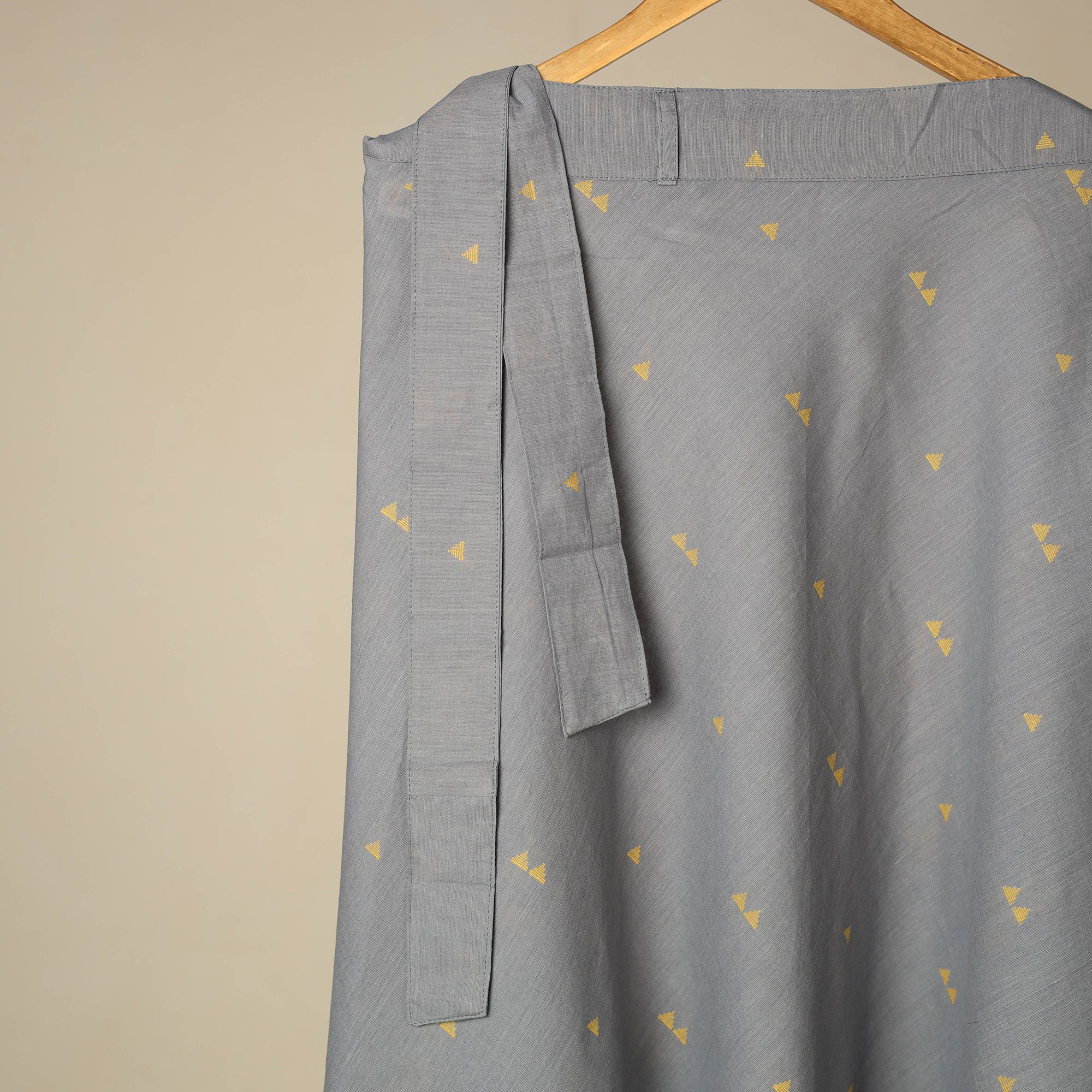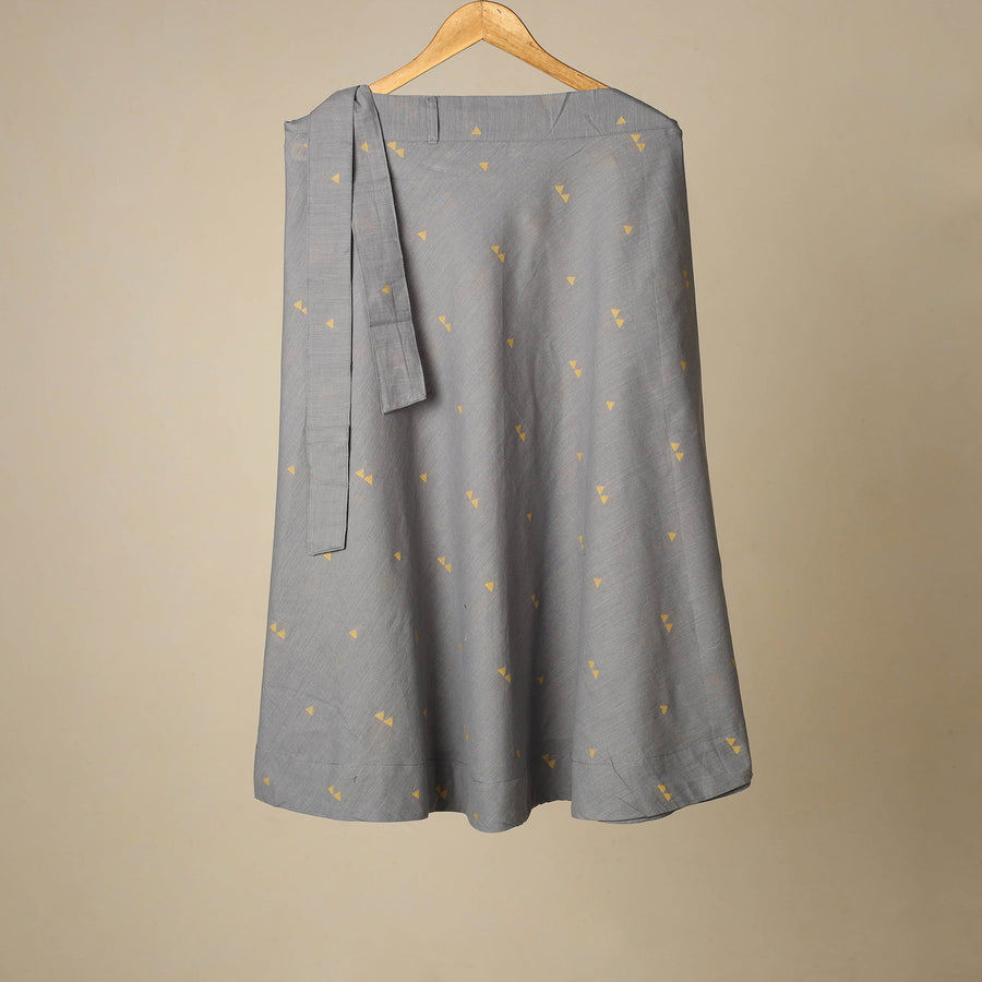 Grey jacquard cotton wrap-around skirt offers an easy tie-up waist closure for a comfortable, adjustable fit. Its intricate woven patterns are made using the jacquard weaving technique, giving the fabric a beautifully detailed look. The wrap style makes it effortless to wear and flattering for all body types. Perfect for daily wear, vacations or relaxed outings.