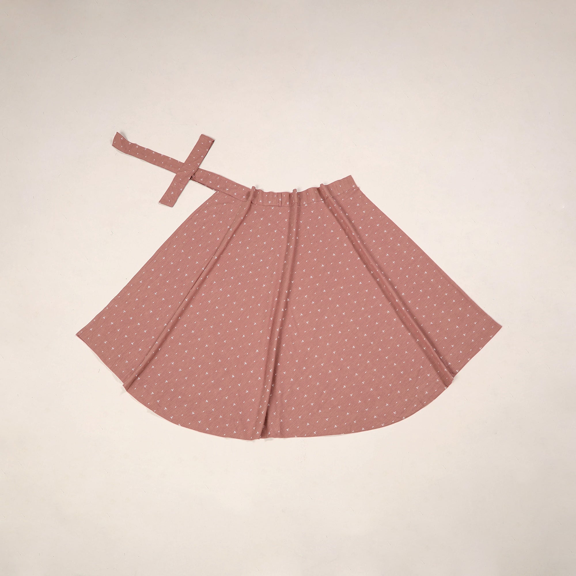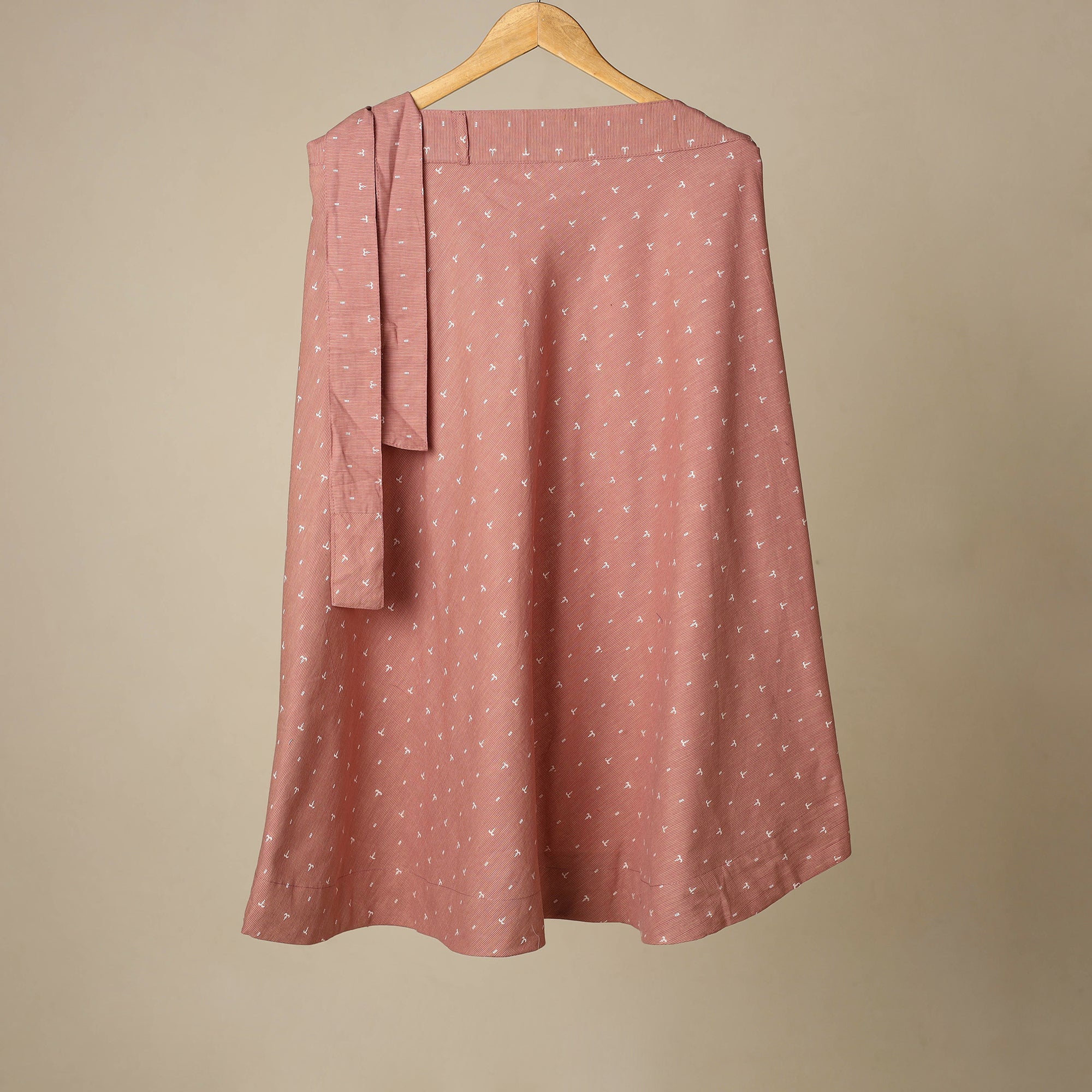 Pink jacquard cotton wrap-around skirt offers an easy tie-up waist closure for a comfortable, adjustable fit. Its intricate woven patterns are made using the jacquard weaving technique, giving the fabric a beautifully detailed look. The wrap style makes it effortless to wear and flattering for all body types. Perfect for daily wear, vacations or relaxed outings.