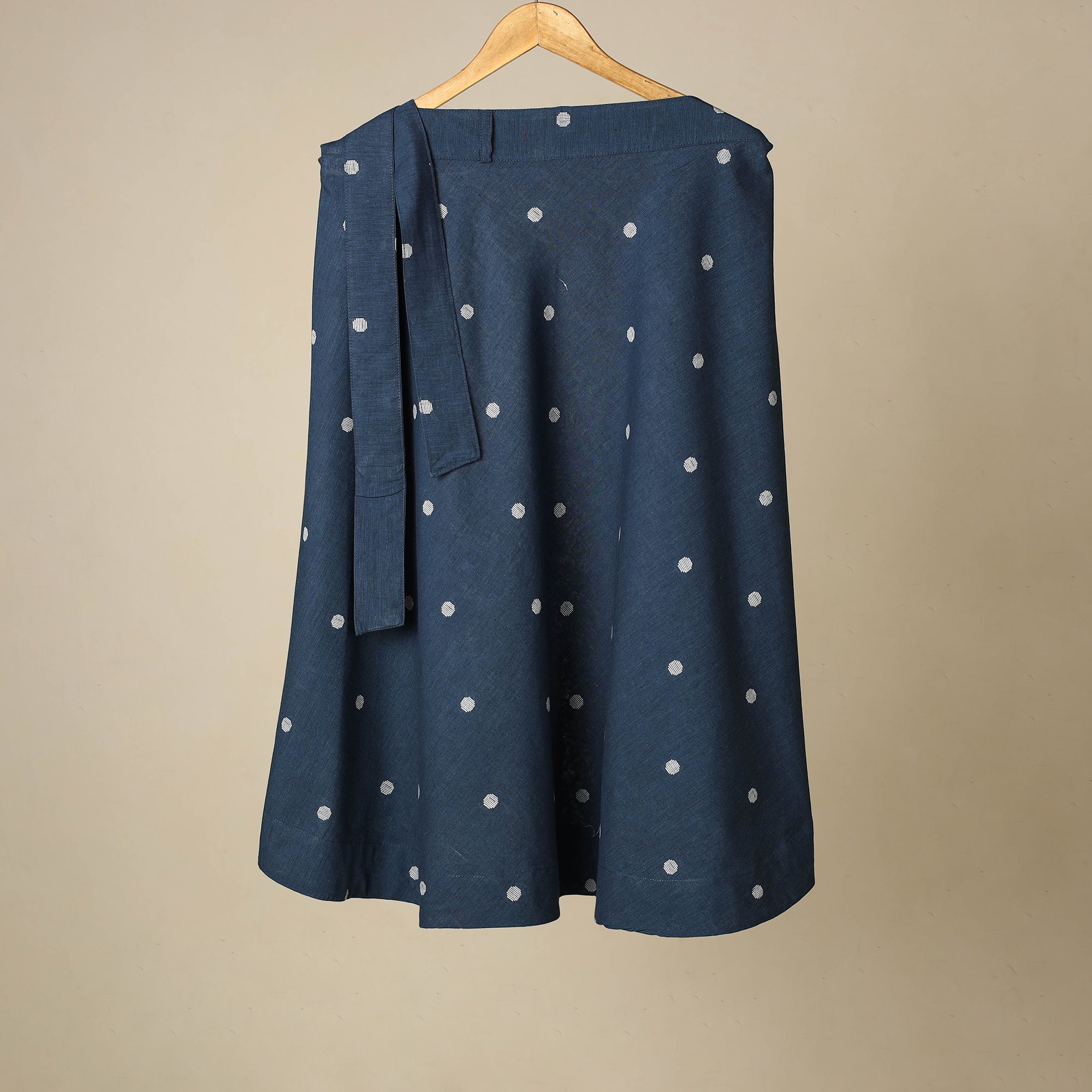 Blue jacquard cotton wrap-around skirt offers an easy tie-up waist closure for a comfortable, adjustable fit. Its intricate woven patterns are made using the jacquard weaving technique, giving the fabric a beautifully detailed look. The wrap style makes it effortless to wear and flattering for all body types. Perfect for daily wear, vacations or relaxed outings.