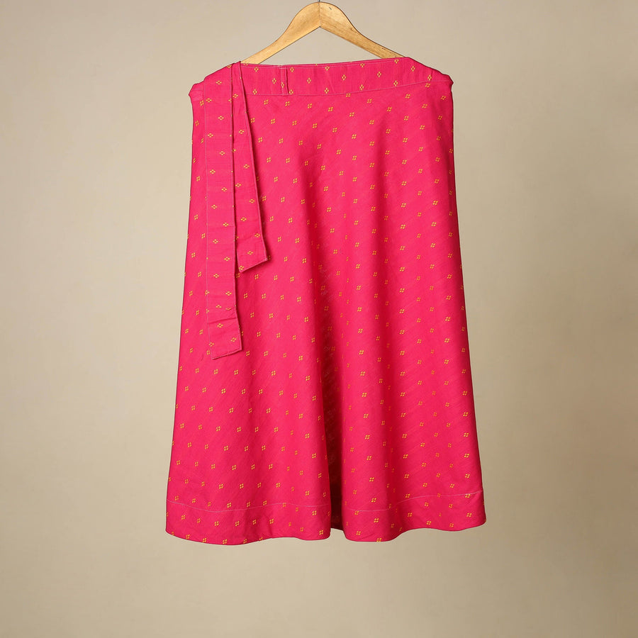 Pink jacquard cotton wrap-around skirt offers an easy tie-up waist closure for a comfortable, adjustable fit. Its intricate woven patterns are made using the jacquard weaving technique, giving the fabric a beautifully detailed look. The wrap style makes it effortless to wear and flattering for all body types. Perfect for daily wear, vacations or relaxed outings.