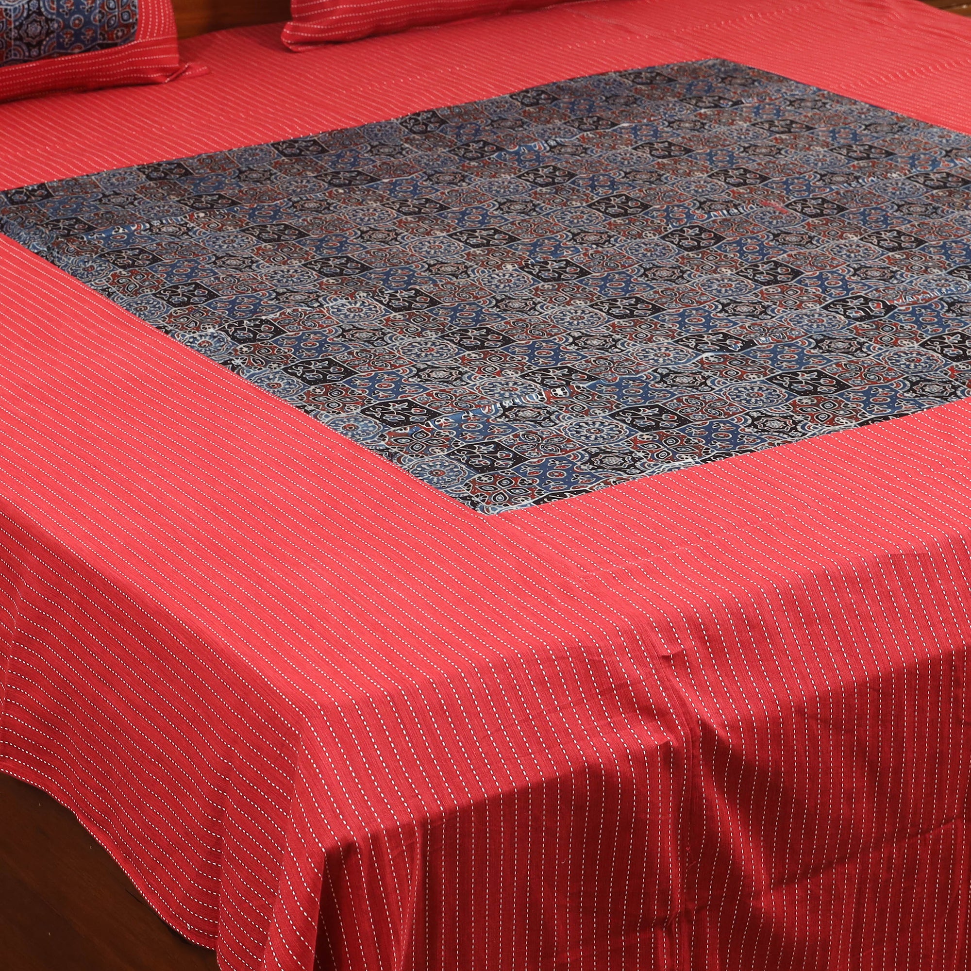 Red - Jacquard with Ajrakh Modal Silk Patch Cotton Bedsheet Set 01