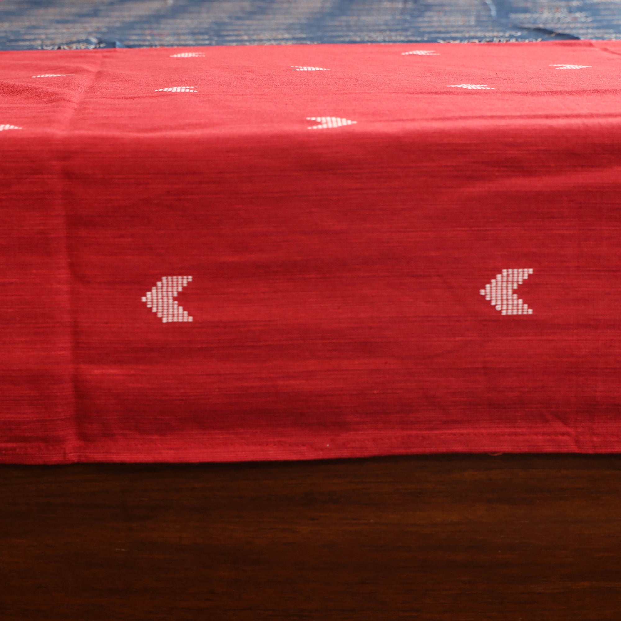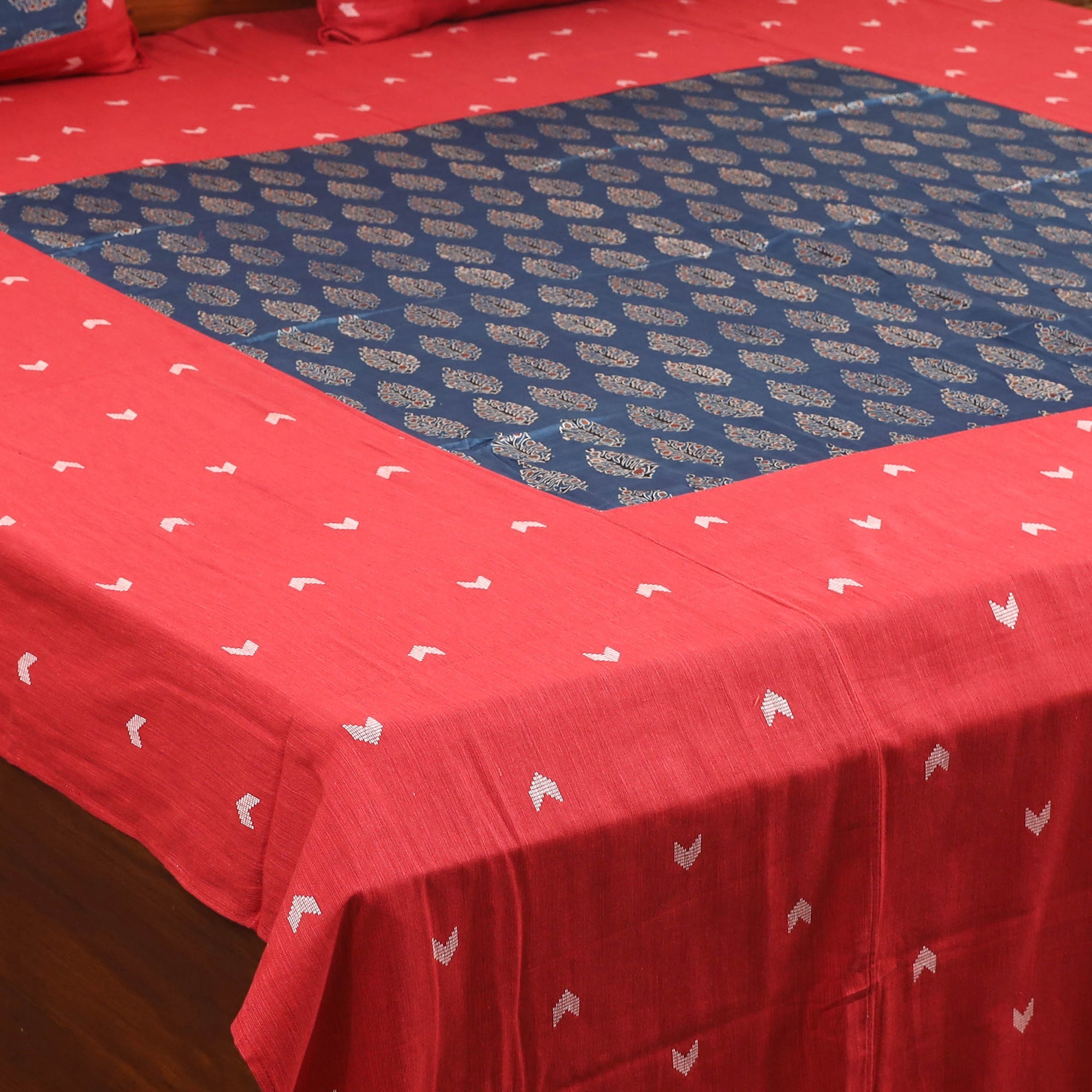 This red cotton bedsheet set beautifully blends jacquard weave with ajrakh block-printed modal silk patches, reflecting traditional artistry with a contemporary flair. Crafted from breathable cotton, it offers lasting comfort and durability. The intricate detailing adds handcrafted charm to your living space. The set includes one double bedsheet and two matching pillow covers, perfect for elevating your home decor with a touch of cultural elegance.