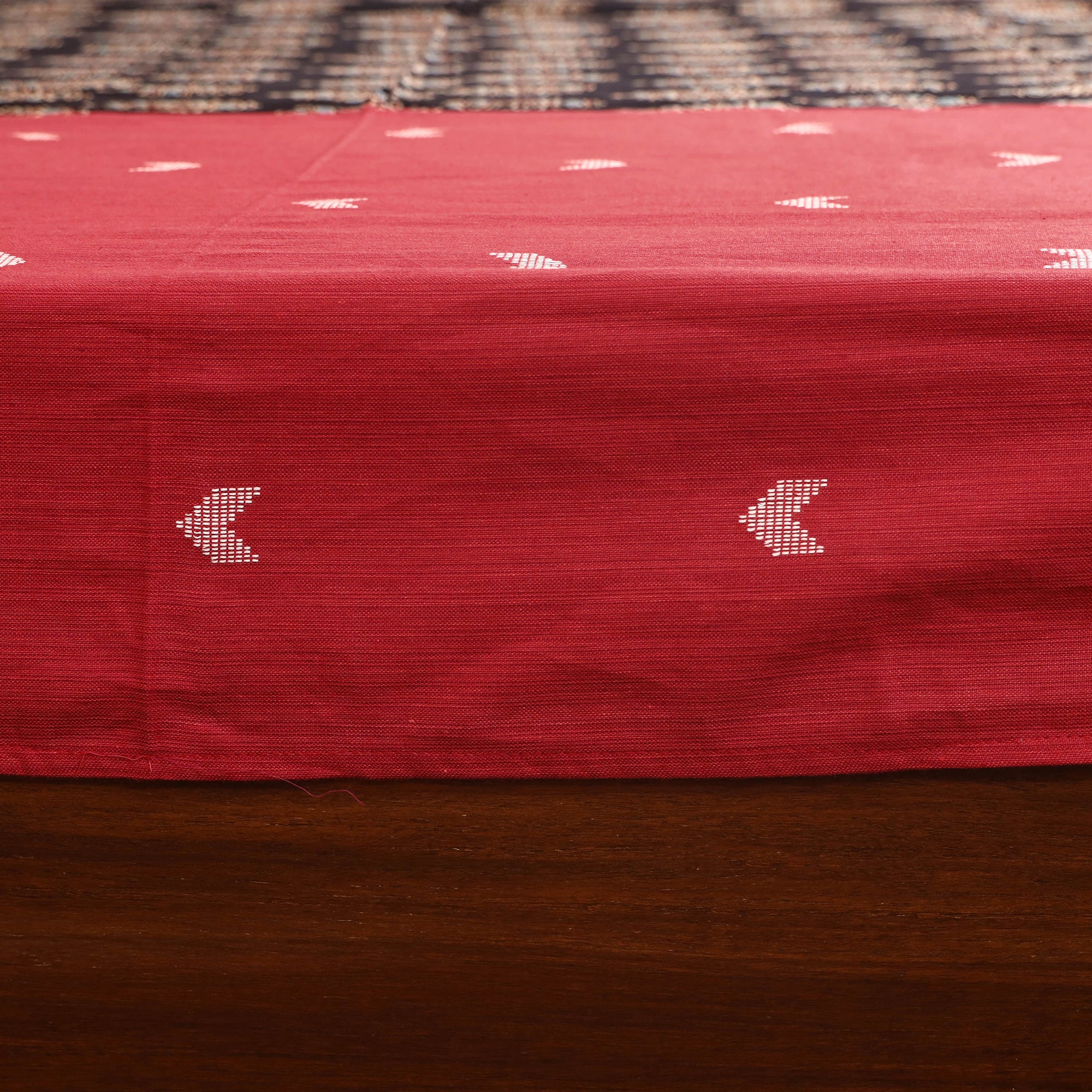 This red cotton bedsheet set beautifully blends jacquard weave with ajrakh block-printed modal silk patches, reflecting traditional artistry with a contemporary flair. Crafted from breathable cotton, it offers lasting comfort and durability. The intricate detailing adds handcrafted charm to your living space. The set includes one double bedsheet and two matching pillow covers, perfect for elevating your home decor with a touch of cultural elegance.