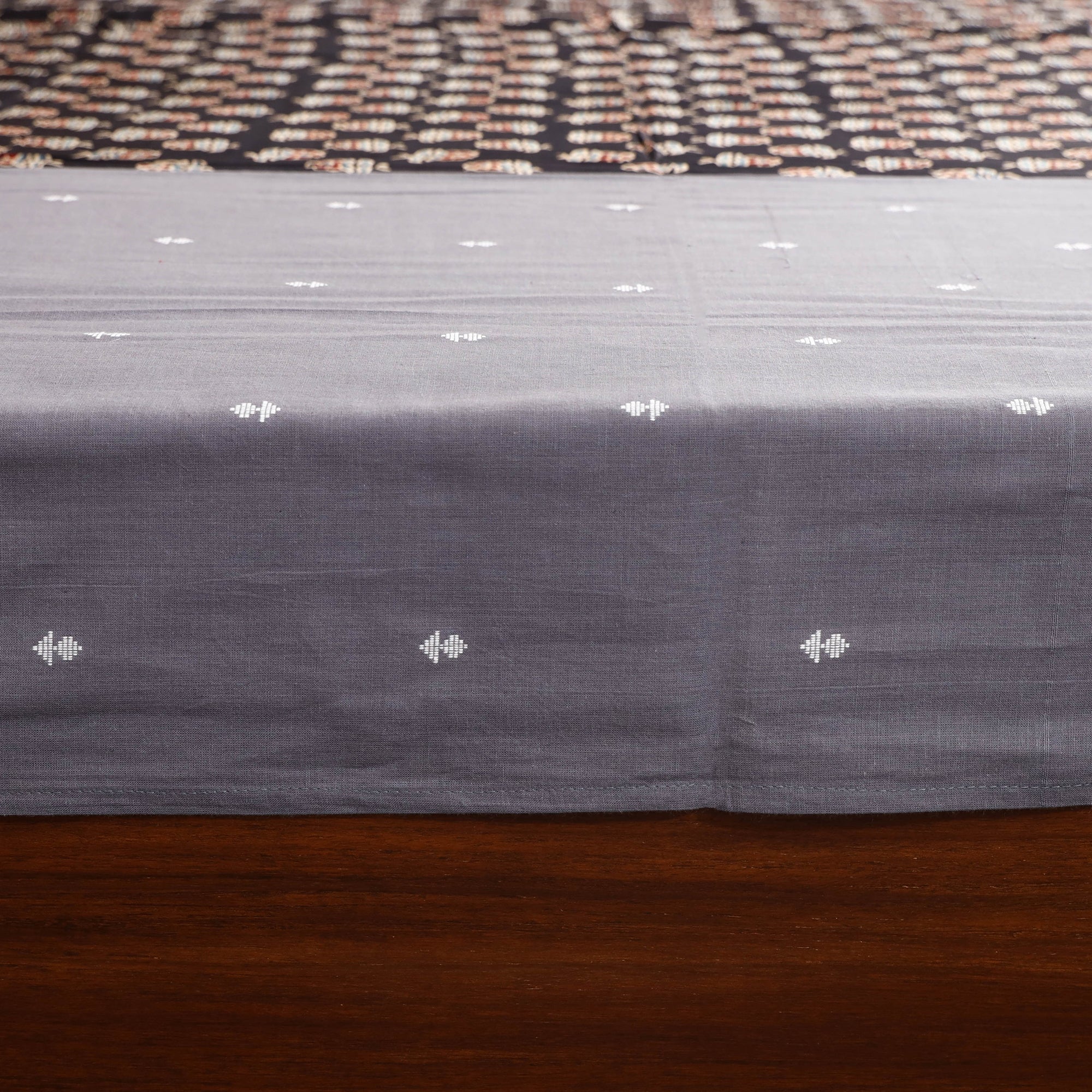 This grey cotton bedsheet set beautifully blends jacquard weave with ajrakh block-printed modal silk patches, reflecting traditional artistry with a contemporary flair. Crafted from breathable cotton, it offers lasting comfort and durability. The intricate detailing adds handcrafted charm to your living space. The set includes one double bedsheet and two matching pillow covers, perfect for elevating your home decor with a touch of cultural elegance.