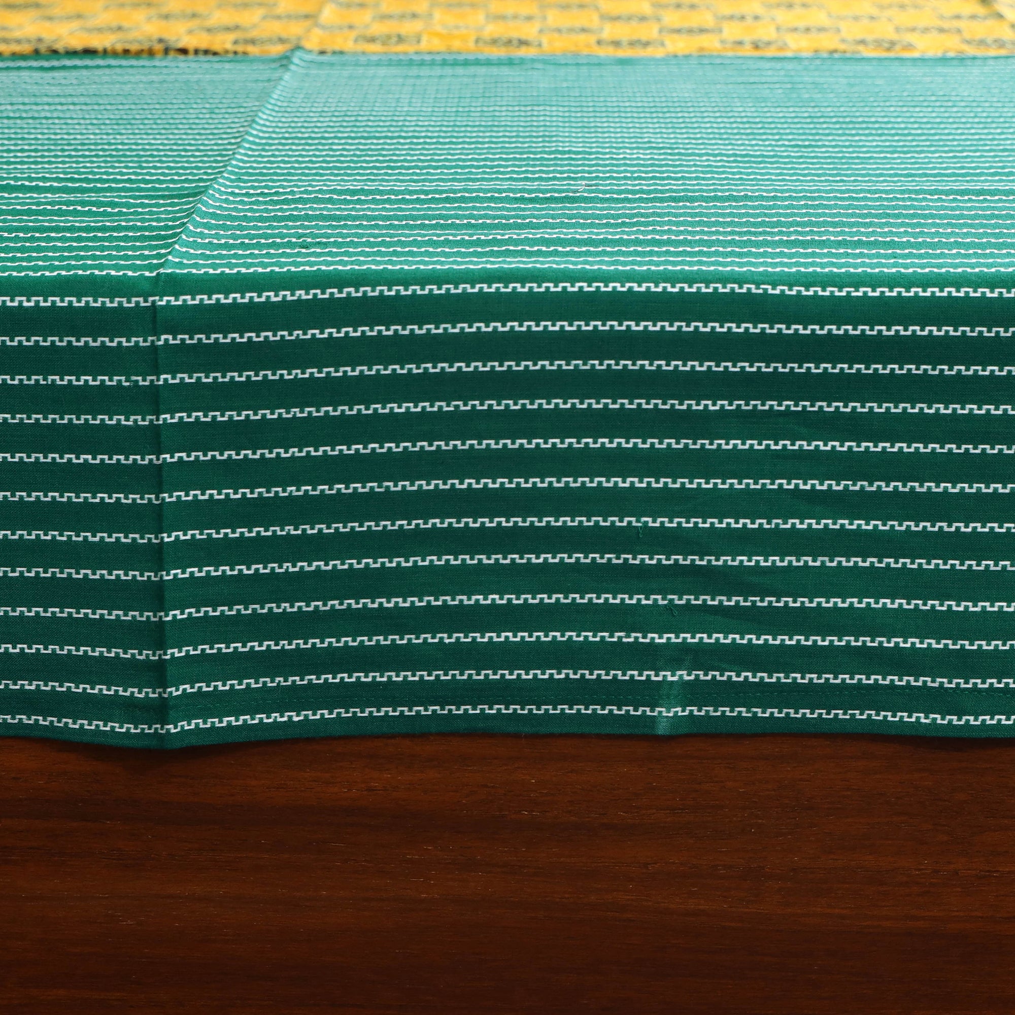 This green cotton bedsheet set beautifully blends jacquard weave with ajrakh block-printed modal silk patches, reflecting traditional artistry with a contemporary flair. Crafted from breathable cotton, it offers lasting comfort and durability. The intricate detailing adds handcrafted charm to your living space. The set includes one double bedsheet and two matching pillow covers, perfect for elevating your home decor with a touch of cultural elegance.