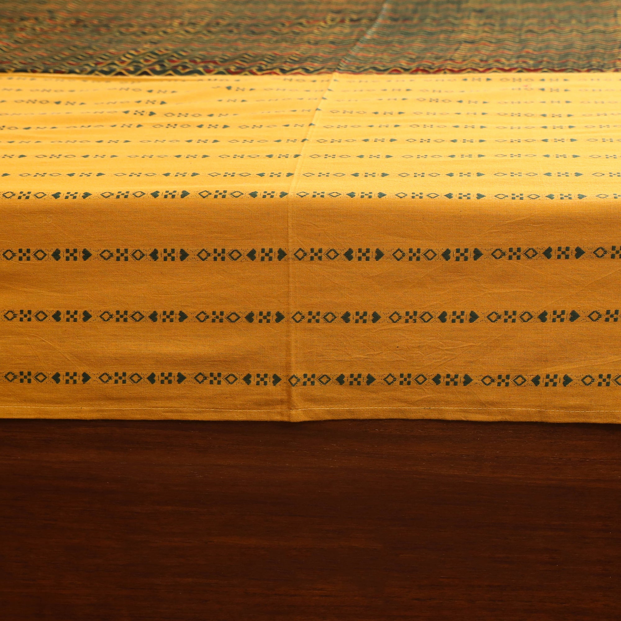 This cotton bedsheet set beautifully blends jacquard weave with ajrakh block-printed modal silk patches, reflecting traditional artistry with a contemporary flair. Crafted from breathable cotton, it offers lasting comfort and durability. The intricate detailing adds handcrafted charm to your living space. The set includes one double bedsheet and two matching pillow covers, perfect for elevating your home decor with a touch of cultural elegance.