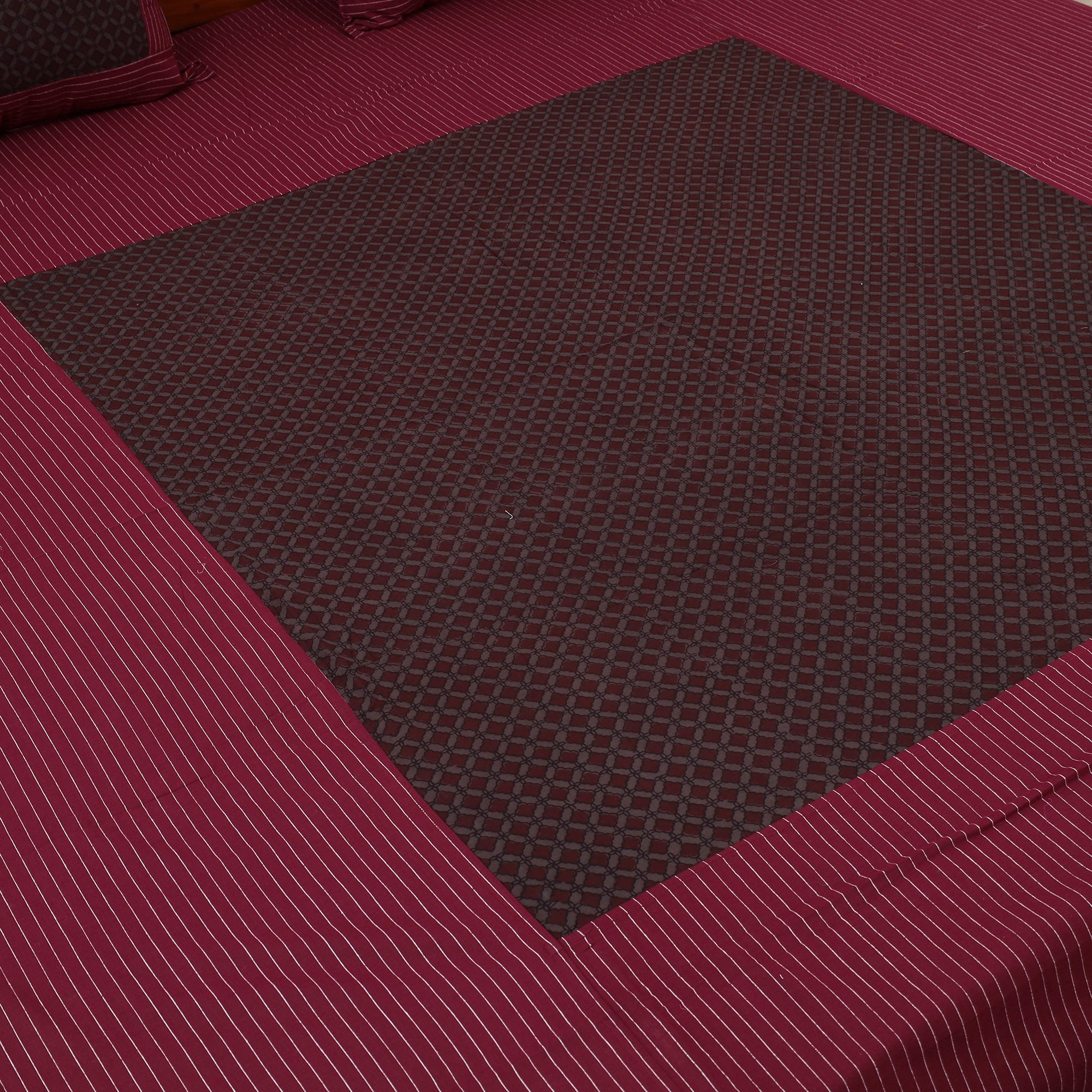 This maroon cotton bedsheet set beautifully combines jacquard fabric with a bagh block print patch, reflecting traditional artistry with a modern aesthetic. Crafted from breathable cotton, it offers both comfort and durability. The intricately detailed design adds a handcrafted charm to your space. This set includes one double bedsheet and two matching pillow covers, making it a perfect addition to your home décor.