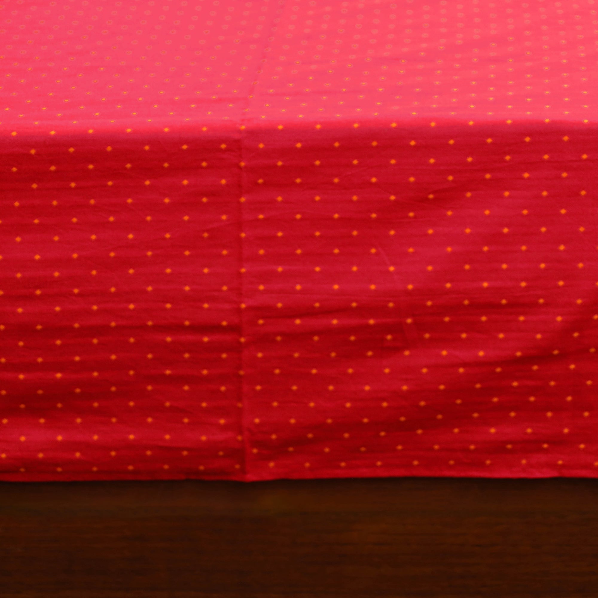 This red cotton bedsheet set features a beautiful blend of jacquard weave with bagh block-printed patches, showcasing traditional artistry with a modern touch. Made from breathable cotton, it ensures comfort and long-lasting use. The detailed design adds a handcrafted charm to your space. The set includes one double bedsheet and two matching pillow covers, making it perfect for enhancing your home decor.