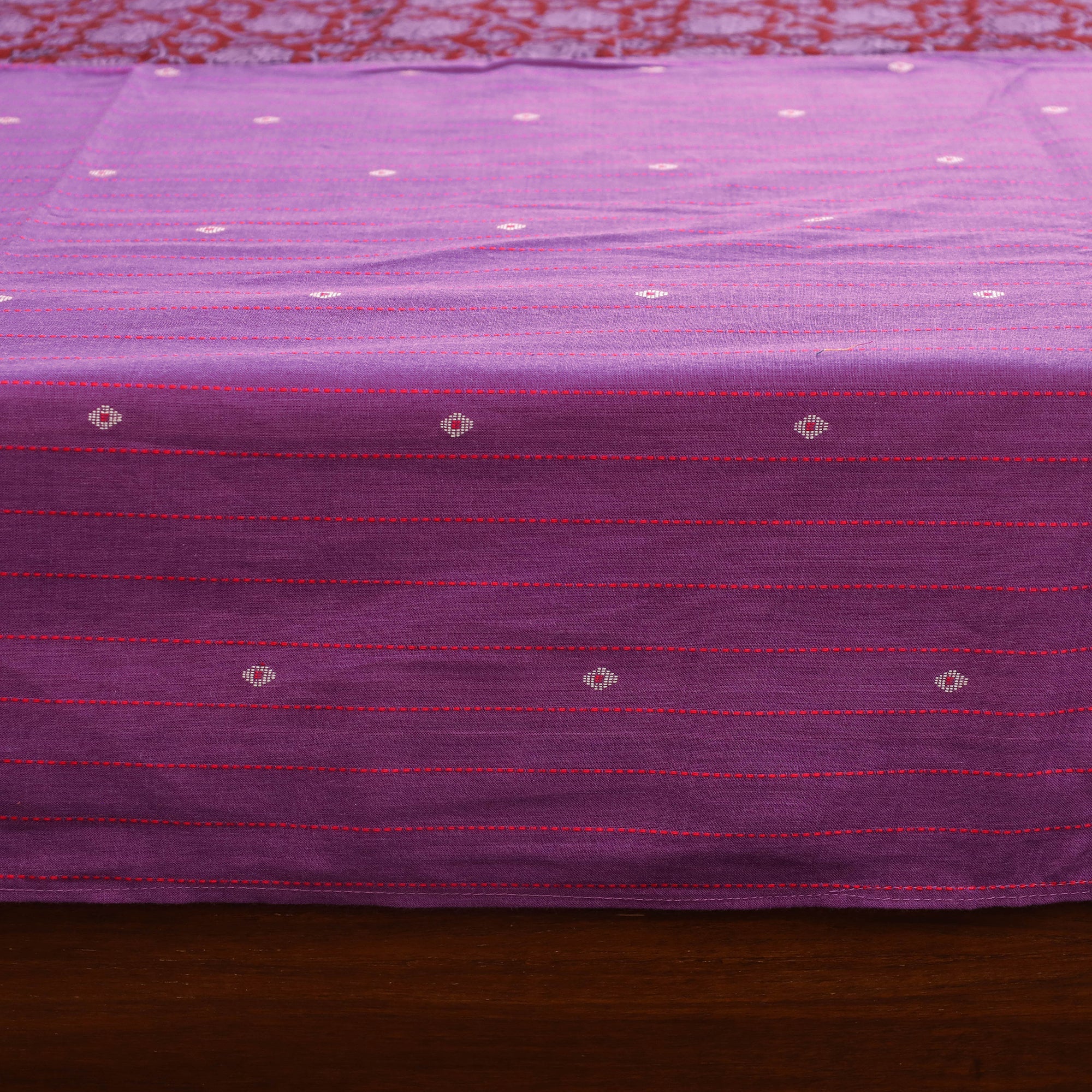 This purple cotton bedsheet set features a beautiful blend of jacquard weave with bagh block-printed patches, showcasing traditional artistry with a modern touch. Made from breathable cotton, it ensures comfort and long-lasting use. The detailed design adds a handcrafted charm to your space. The set includes one double bedsheet and two matching pillow covers, making it perfect for enhancing your home decor.