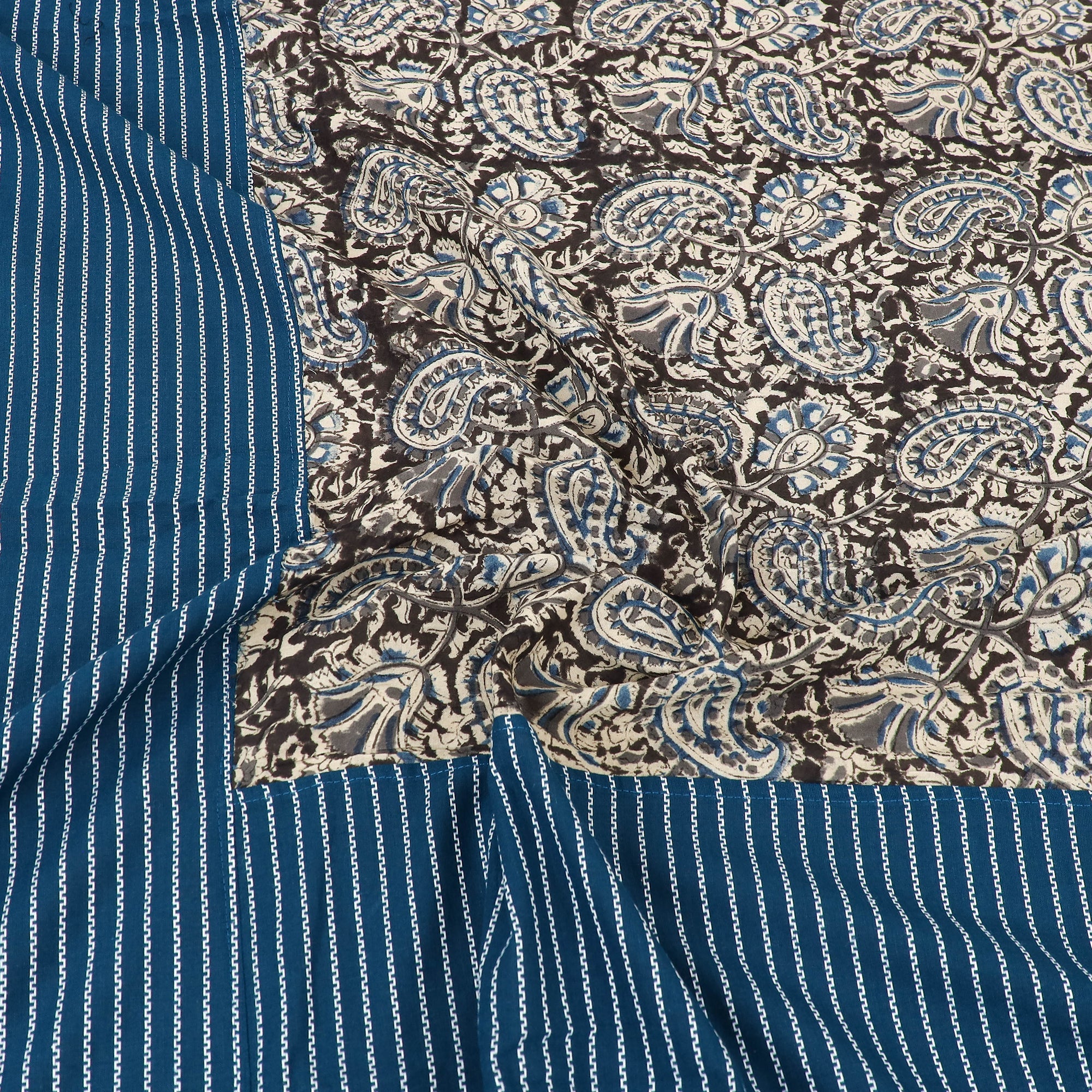 This blue jacquard cotton bedsheet set with kalamkari block print patchwork blends the charm of Indian crafts with detailed stitched patchwork. Made from cotton, it ensures both comfort and long-lasting use. The striking patch design brings a unique character to the jacquard base. The set includes one double bedsheet and two matching pillow covers, perfect to add a handcrafted touch to your room.
