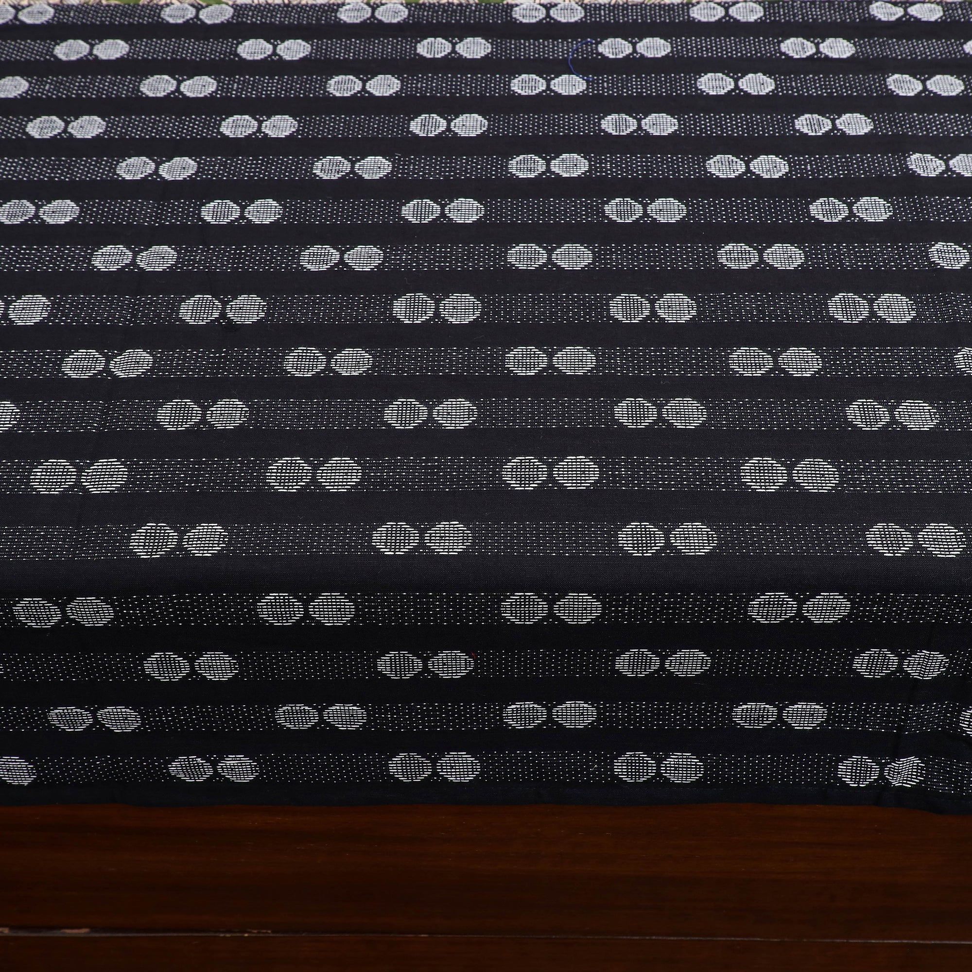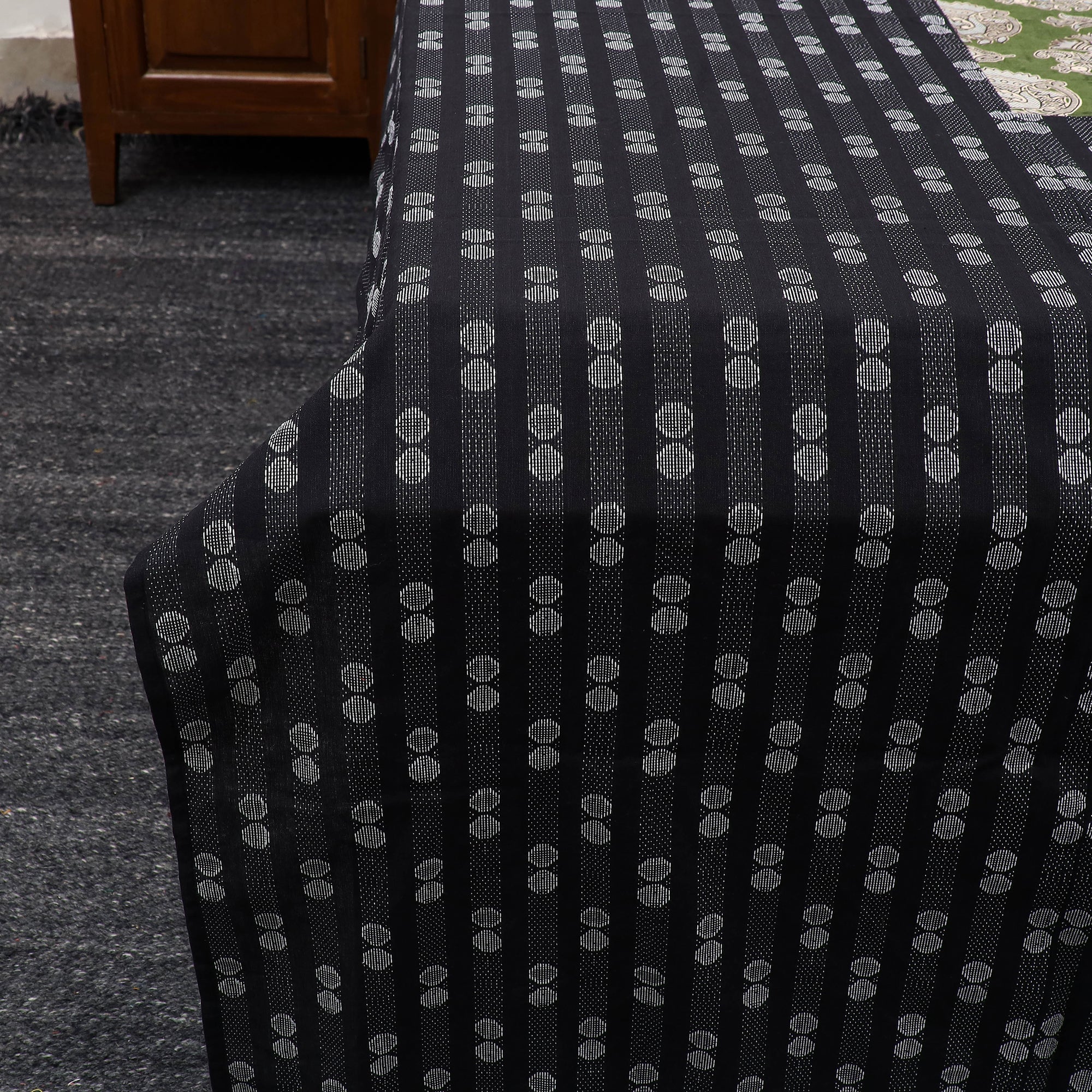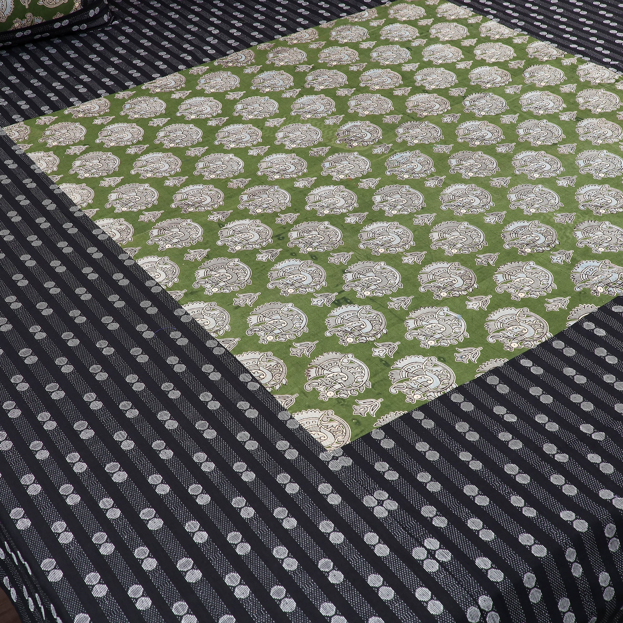This black jacquard with kalamkari printed patch cotton bedsheet set beautifully combines Indian textile traditions with stitched patchwork. Made from soft cotton, it offers both comfort and durability. The striking patch design adds a distinctive touch to the jacquard base. The set includes one double bed cover and two matching pillow covers, perfect to lend your room a handcrafted appeal.