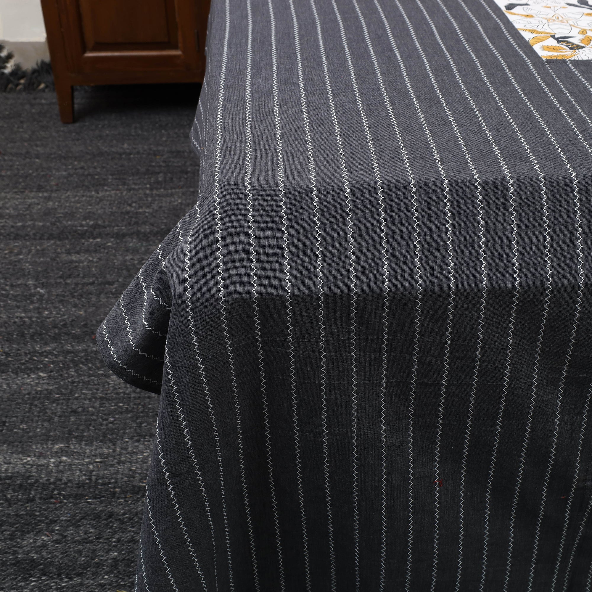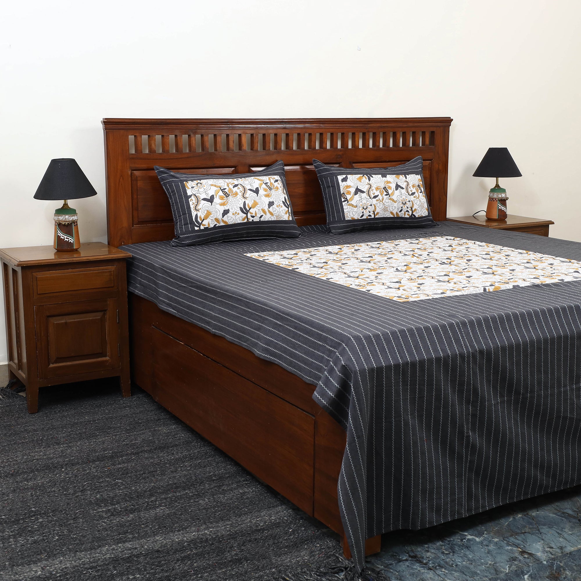 This black cotton bedsheet set features a beautiful fusion of jacquard and sanganeri block print patchwork, presenting traditional techniques with a modern flair. Crafted from breathable cotton, it offers lasting comfort and durability. The intricate design adds a handcrafted aesthetic to your home. The set includes one double bedsheet and two matching pillow covers, making it ideal for enhancing your home decor.