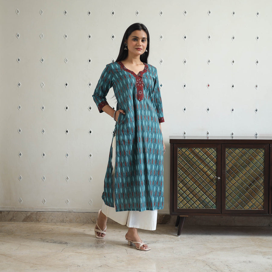 Look and feel beautiful in this uniquely designed Jahota block print cotton straight kurta. Crafted from naturally dyed breathable cotton fabric, this straight-fit kurta provides comfort for all-day wear and features a convenient side pocket for carrying small essentials.