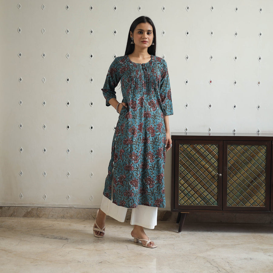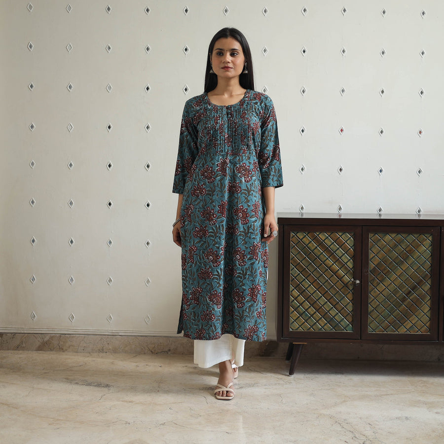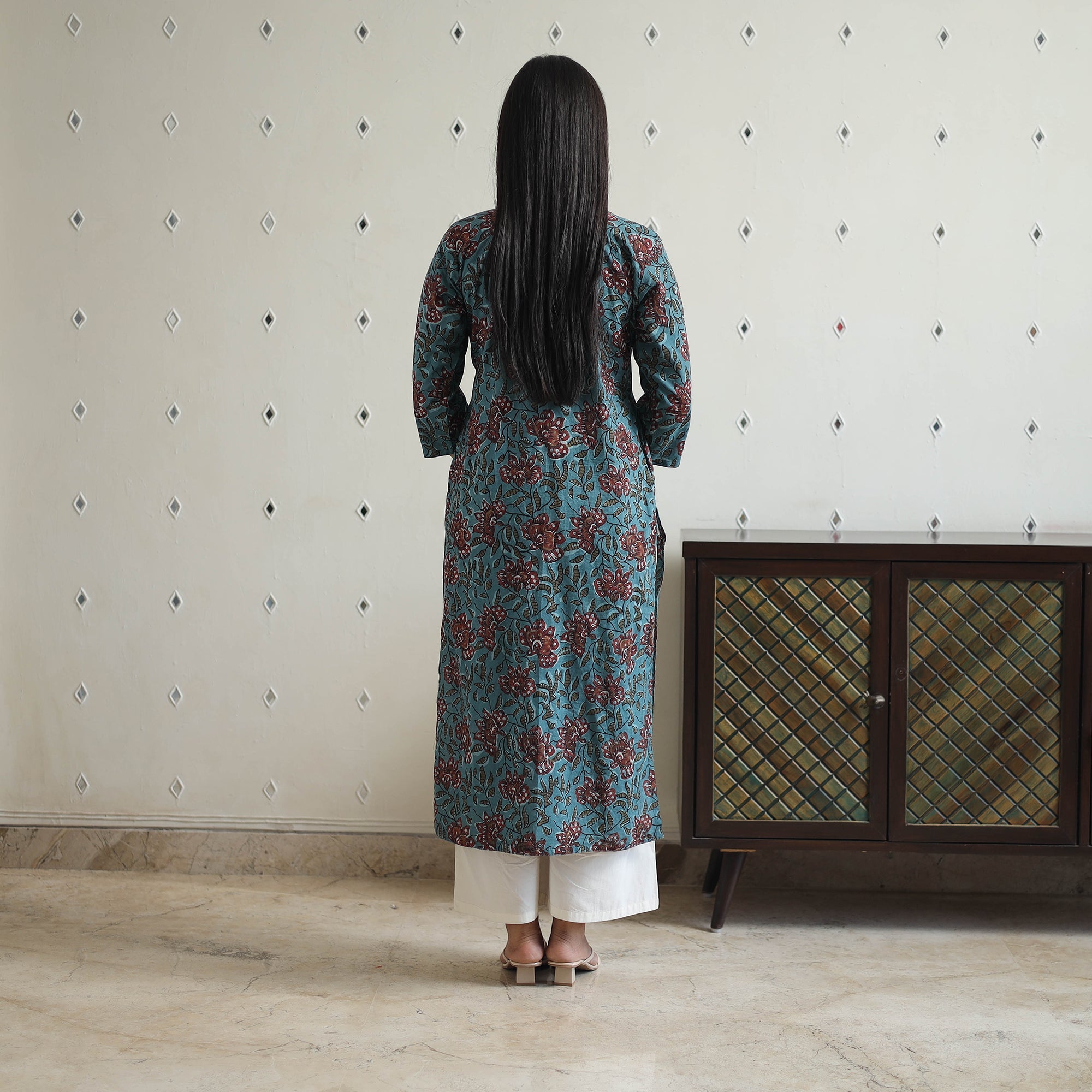 Look and feel beautiful in this uniquely designed blue Jahota block print cotton straight kurta. Crafted from naturally dyed breathable cotton fabric, this straight-fit kurta provides comfort for all-day wear and features a convenient side pocket for carrying small essentials.
