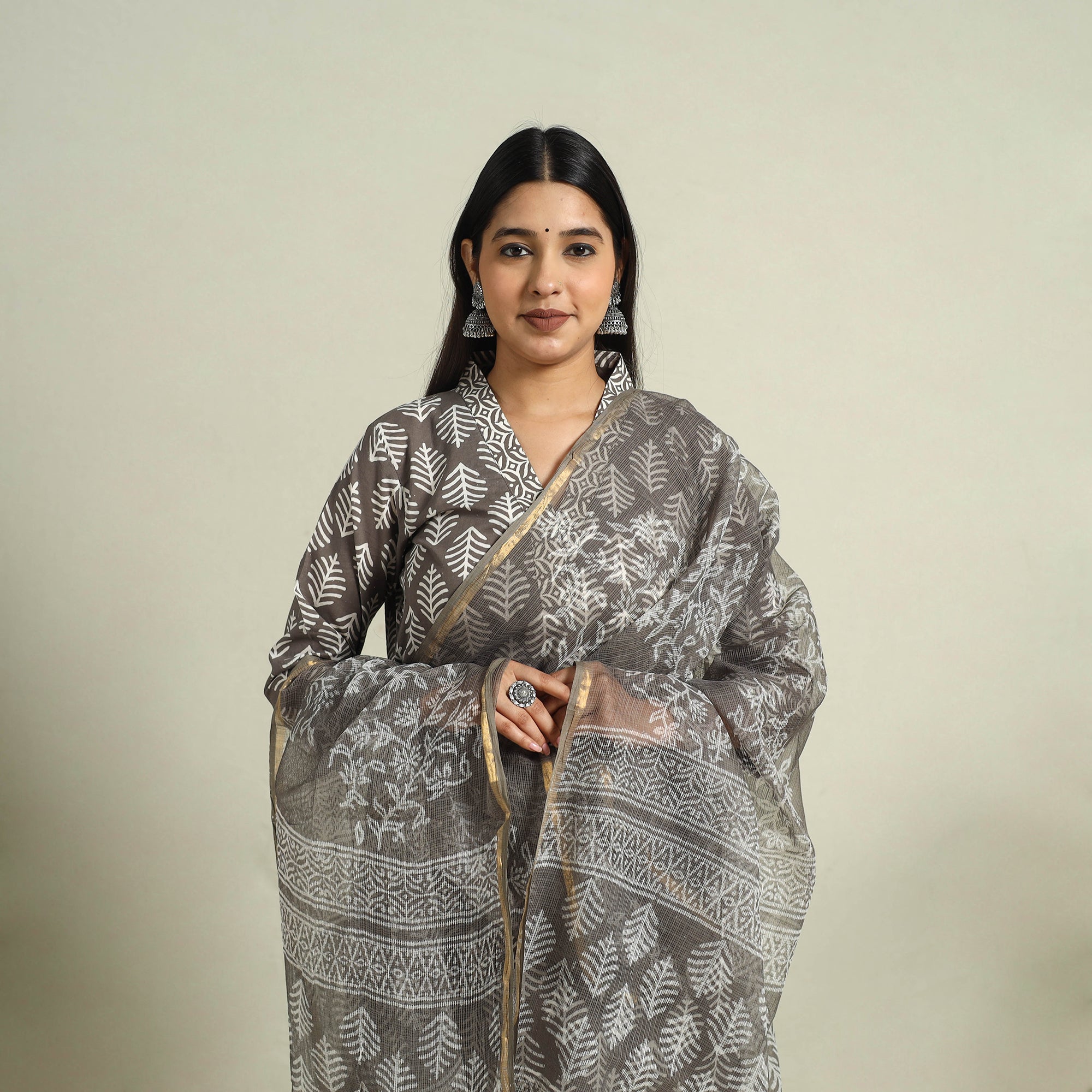 Celebrate the vibrant artistry of Rajasthan with this cotton brown jaipur print kurta set. Jaipur printing, known for its delicate floral motifs, adds charm to the ensemble. The set features a comfortable kurta with a side pocket, a matching elasticated waist salwar, and a kota doria cotton dupatta. Ideal for festive gatherings or casual outings, it beautifully blends tradition with everyday comfort.