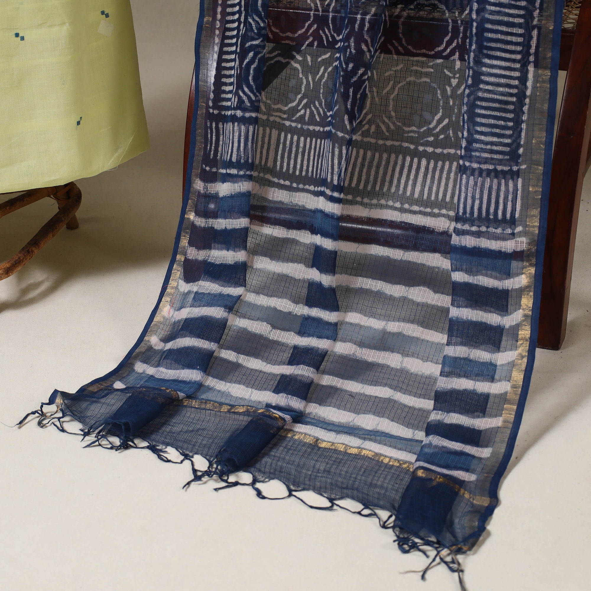 Bring home the charm of Indian crafts with this green 2pc jamdani cotton dress material. The kurta fabric features traditional handloom jamdani weaving, paired with a light kota doria dupatta adorned in bagru-style indigo prints. The set also comes with a handcrafted necklace and matching earrings add finesse. A graceful pick for festive gatherings, ethnic parties, or cultural celebrations.