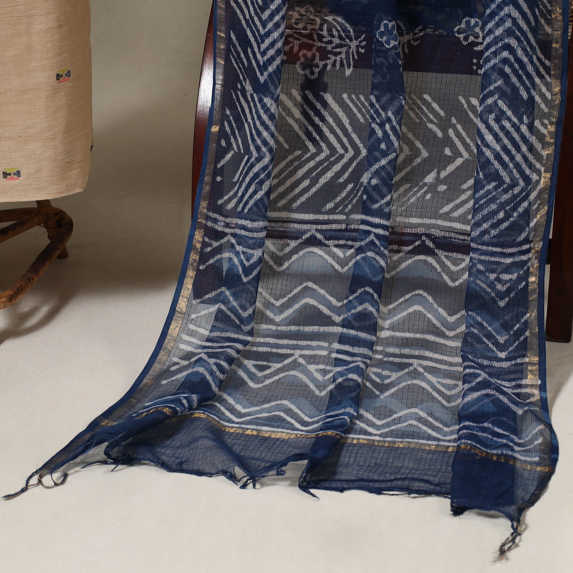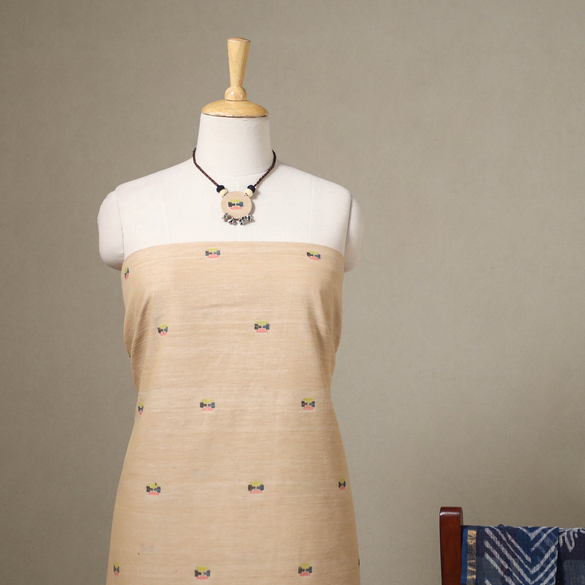 Bring home the charm of Indian crafts with this beige 2pc jamdani cotton dress material. The kurta fabric features traditional handloom jamdani weaving, paired with a light kota doria dupatta adorned in bagru-style indigo prints. The set also comes with a handcrafted necklace and matching earrings add finesse. A graceful pick for festive gatherings, ethnic parties, or cultural celebrations.