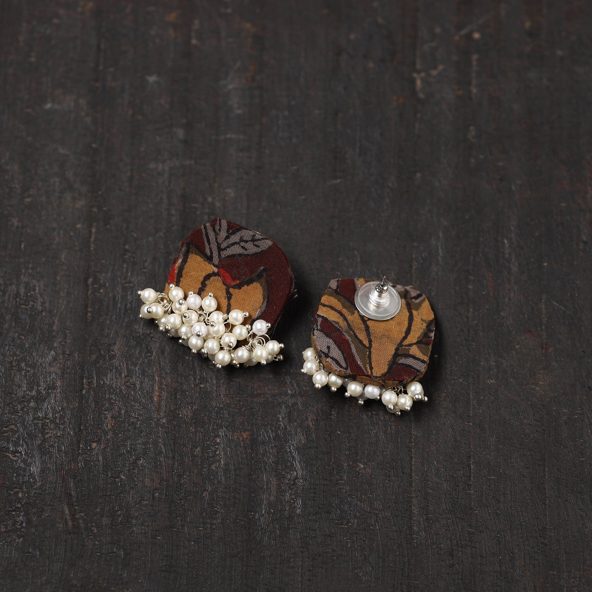 Add a touch of maroon handcrafted charm to your ensemble with these fabart pearl earrings. Made by skilled artisans, each pair beautifully combines delicate pearl accents with a fabric based design. These earrings represent a perfect fusion of traditional aesthetics and modern flair ideal for festive occasions, everyday style, or thoughtful gifting.