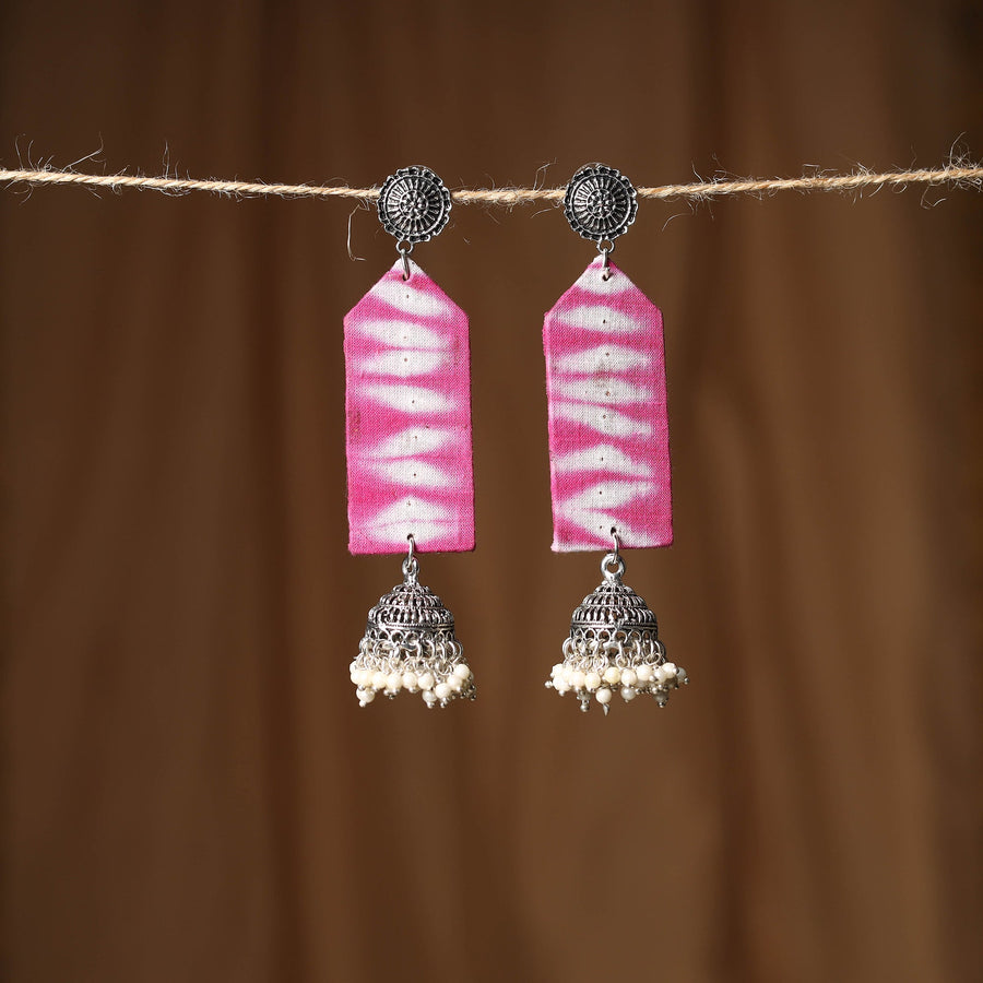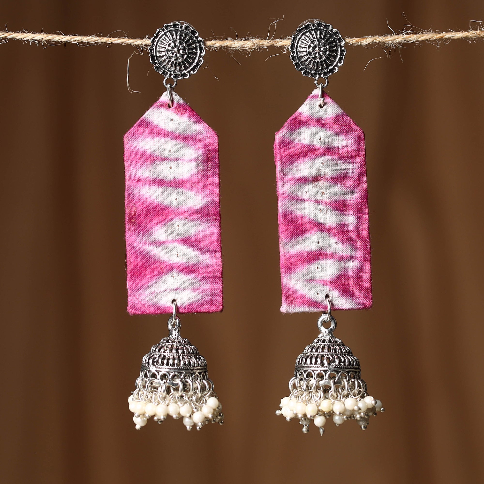 Add a unique flair to your outfit with these pink handmade fabric earrings. A German silver jhumki is attached at the end, adorned with beads that enhance its charm. Perfect for everyday wear or special occasions, these earrings blend traditional style with a playful touch.