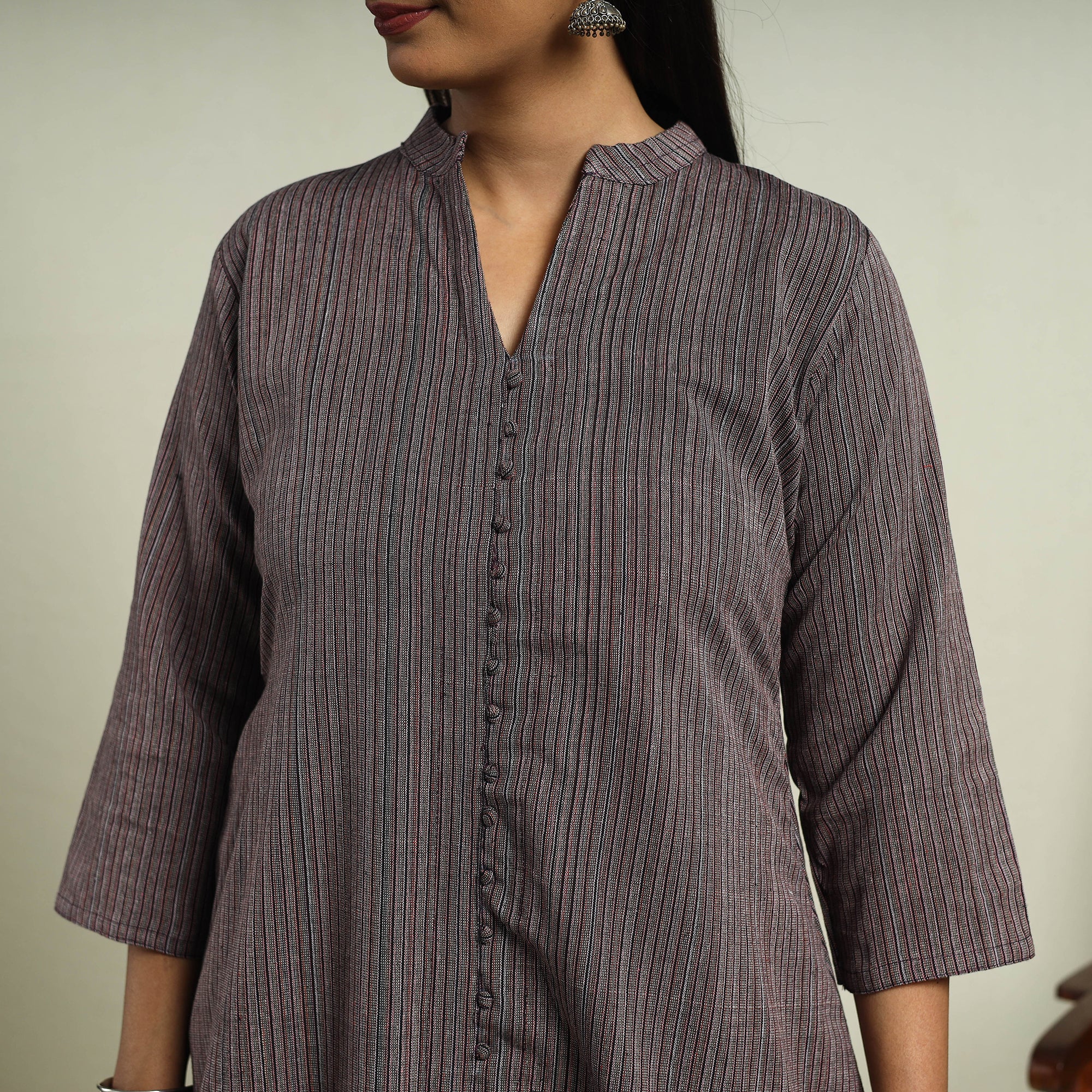 Look stylish and stay comfortable with this dark grey jhiri handloom a-line cotton kurta, made using traditional weaving techniques from Rajasthan. It also features a convenient one-side pocket, making it perfect for casual outings and festive occasions.