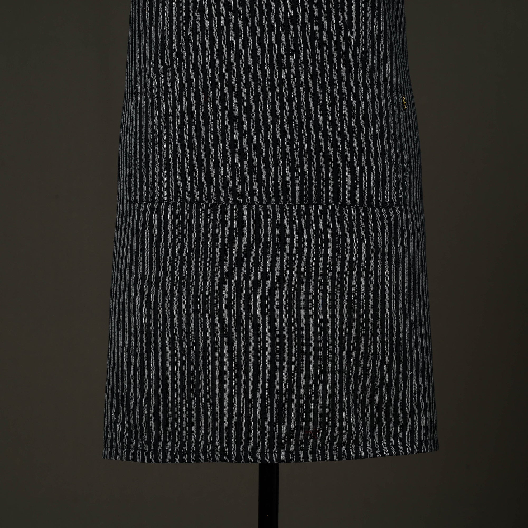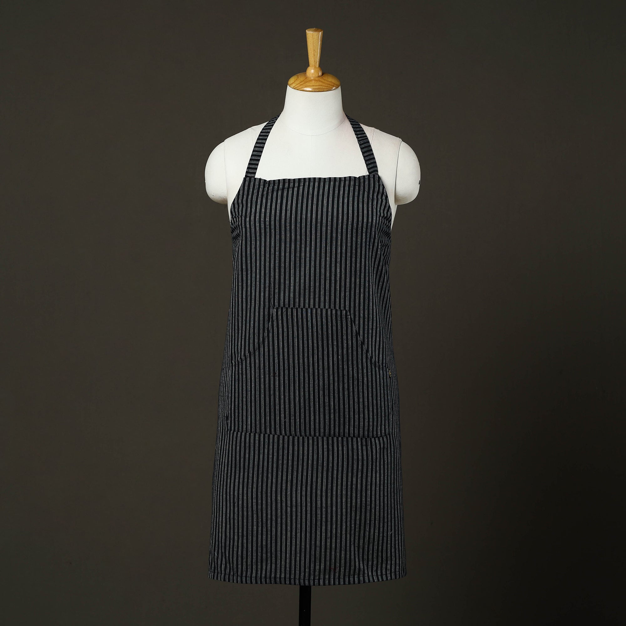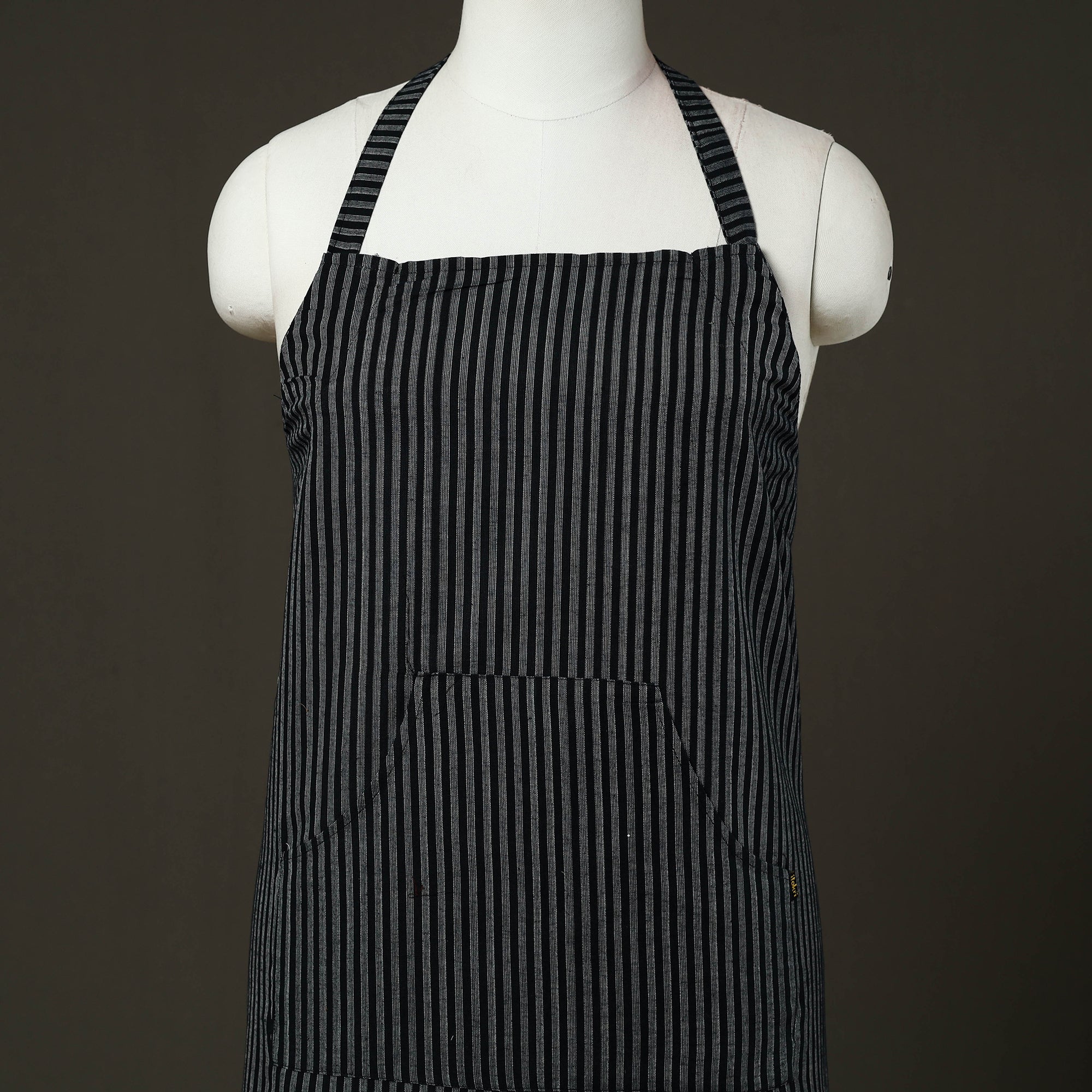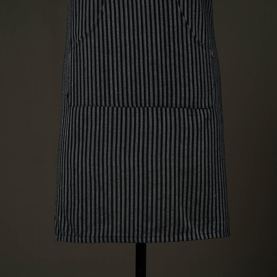 Upgrade your kitchen style with this black jhiri handloom cotton apron with pocket, crafted in Rajasthan using traditional handloom weaving techniques. Made from soft, breathable cotton, it is lightweight. Designed to protect your clothing from splashes and spills, this handmade kitchen apron offers an adjustable neck strap and a front pocket for added convenience, making it ideal for daily cooking and baking.