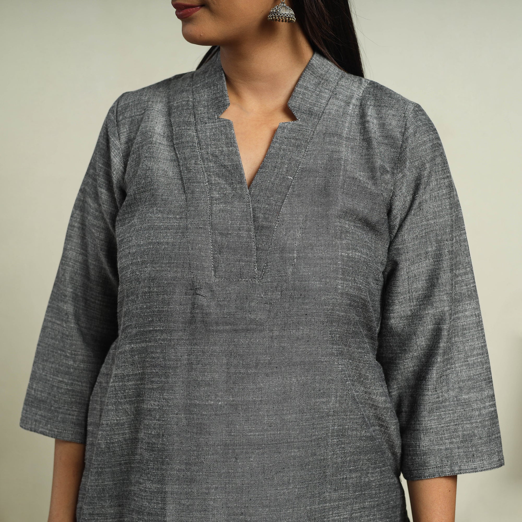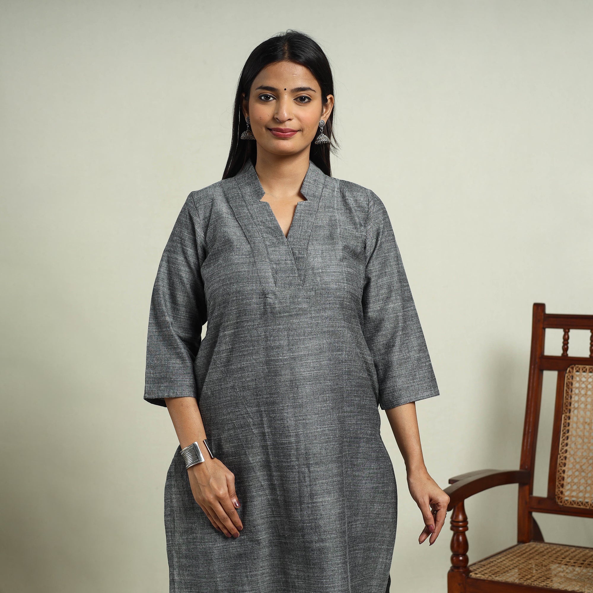 Look stylish and stay comfortable with this dark grey jhiri handloom straight cotton kurta, made using traditional weaving techniques from Rajasthan. It also features a convenient one-side pocket, making it perfect for casual outings and festive occasions.