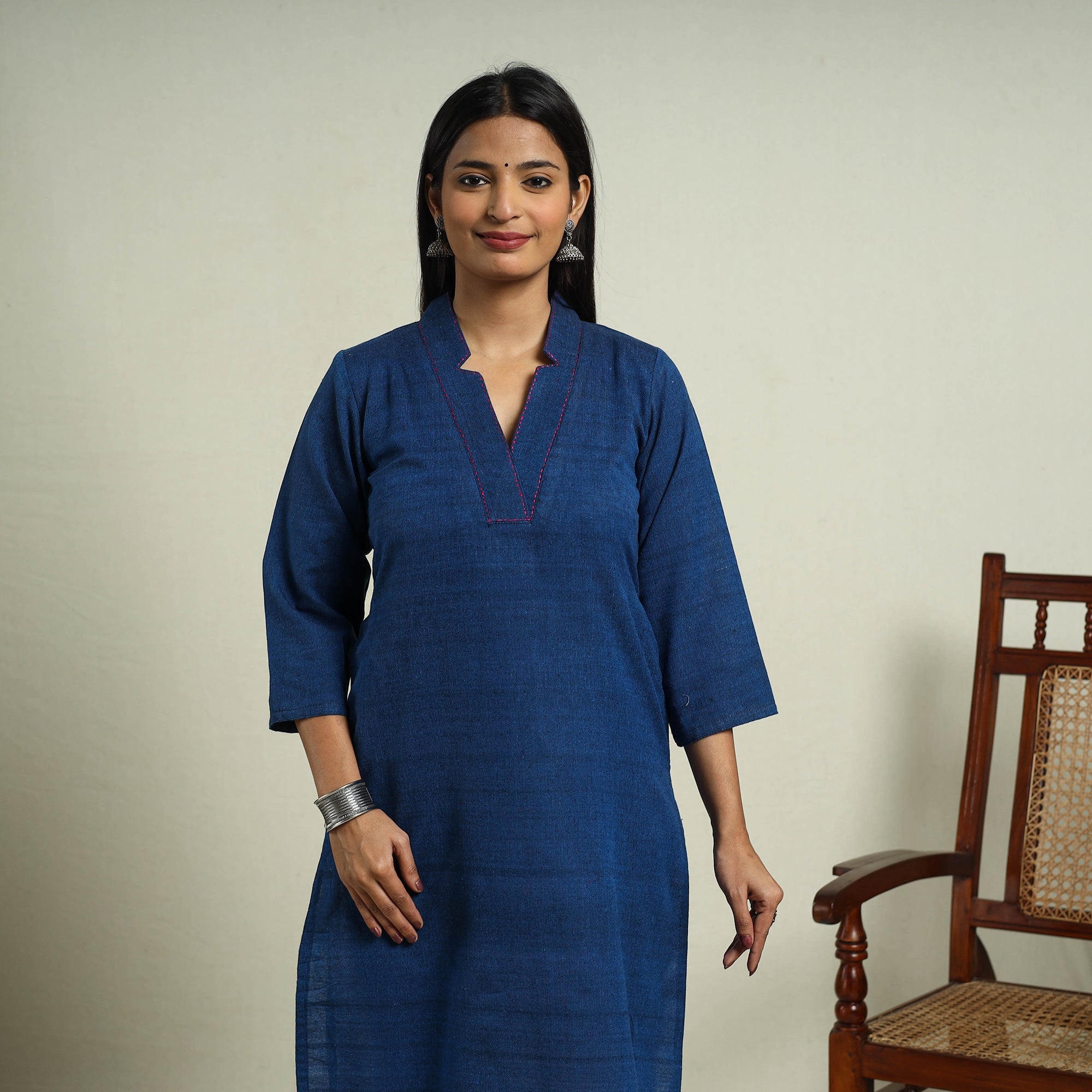 Look stylish and stay comfortable with this blue jhiri handloom straight cotton kurta, made using traditional weaving techniques from Rajasthan. It also features a convenient one-side pocket, making it perfect for casual outings and festive occasions.